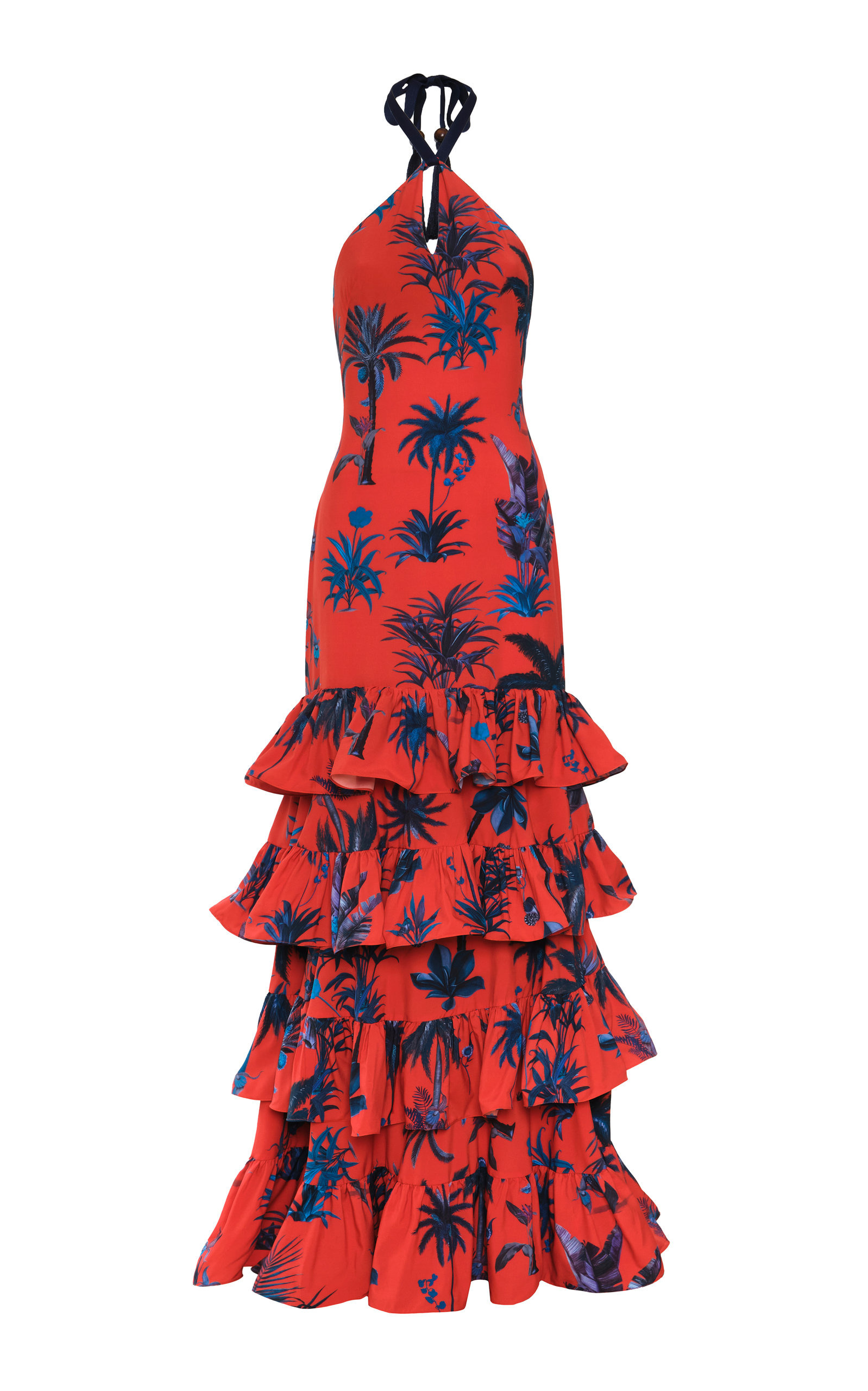 PRODUCT DETAILS - As featured in the Pre-Fall '22 lookbook, wear yours with sandals to mirror the brand styling - Tailored fit, halter neck, tiered skirt, maxi hem, lined - Zip fastening - Composition: Crepe 95% Recycled Polyester 5% Spandex - Dry Clean Only - Made in Colombia SIZE & FIT - True to size - Model wears a size 4