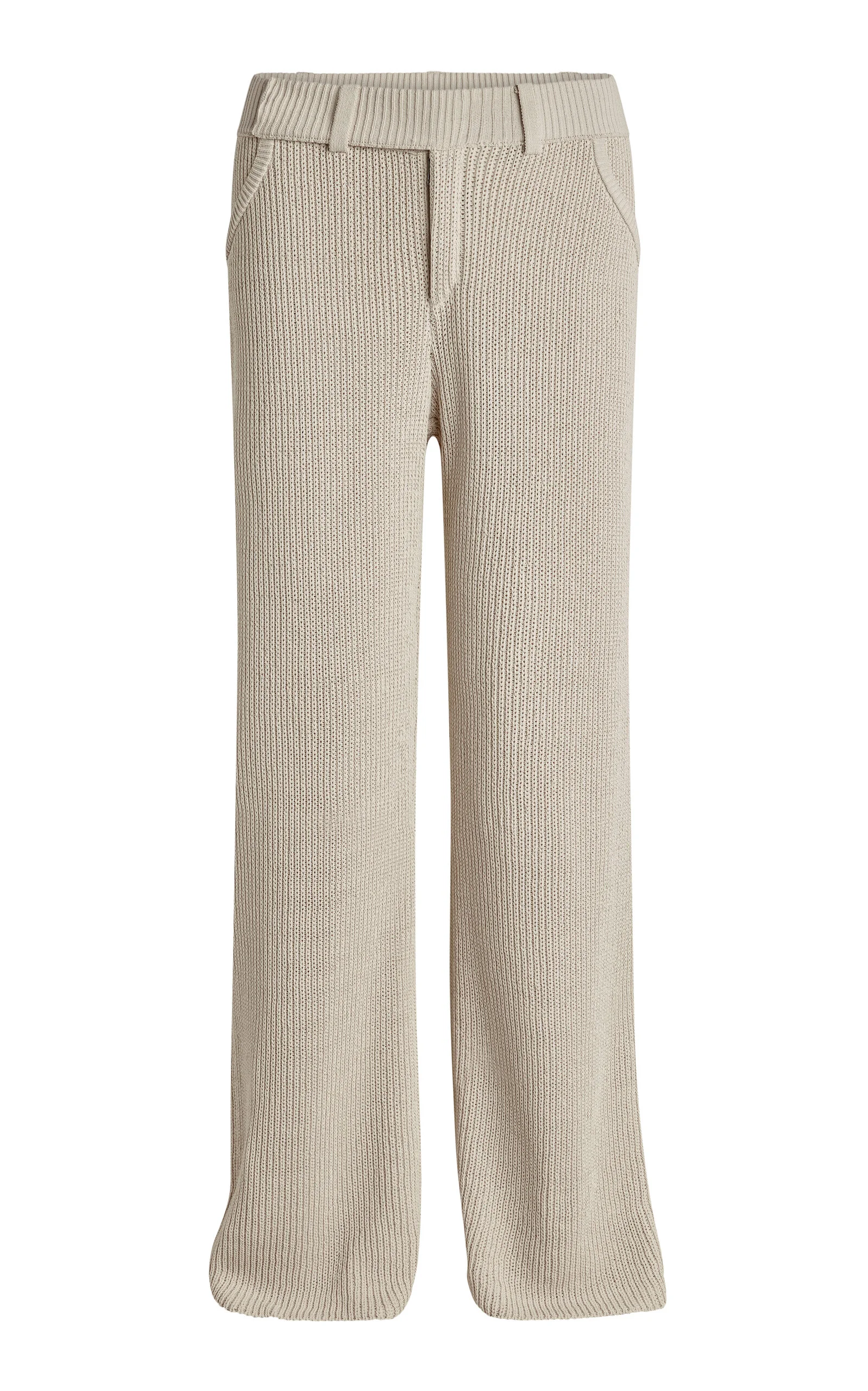 With an eye for cuts that flatter with sensual ease, L.A.-based Tina Rodiou has virtually filled a niche in the industry for hyper-cool, seductive, and notably well-priced minimalism that doesn’t compromise on sustainability—and which you won’t find anywhere else. P.S. their sumptuous knits are always a win. These low-waisted trousers are knit from a cotton-blend, texturized with a ribbed design, and drape loosely over the legs. PRODUCT DETAILS - Resort '25 - Concealed zip and hook fastening - Composition: 72% Cotton, 28% Polyamide - Dry clean only - Imported SIZE & FIT - Designed for a relaxed fit