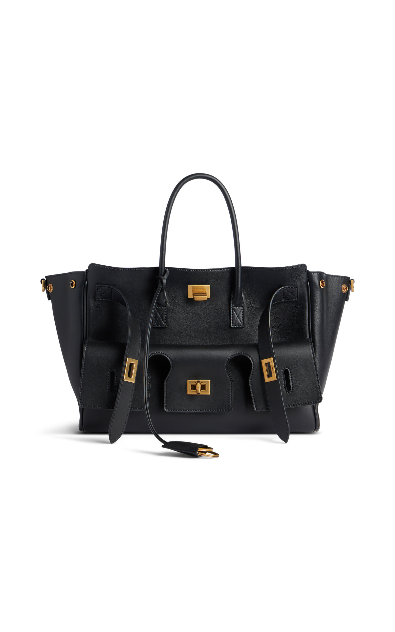 Renowned for their sleek, fluid lines and statement-making garnishes, Balenciaga’s meticulously crafted accessories always have the right amount of edge. Each piece either pays homage to legendary house signatures or displays fresh, out-of-the-box innovation—oftentimes, simultaneously. The 'Rodeo' bag's big sister, the 'Bel Air' is a generously-sized, carry-all design crafted from smooth calfskin leather and detailed with gold-tone hardware. PRODUCT DETAILS - Twist lock fastening - Composition: 100% calfskin leather - Made in Italy