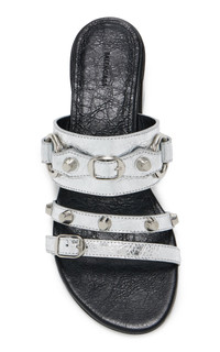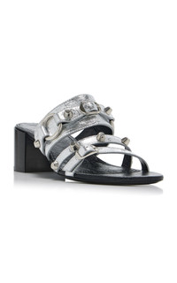Experimental and minimalistic by design, Balenciaga is also renowned for its uncompromising standard and avant-garde creativity. The brand continues to live and breathe Balenciaga’s inherent elegance, balanced with the designer’s edgy, urban aesthetic. Crafted from crinkled metallic leather, these heeled sandals feature the same hardware as the house's iconic 'City' bags. PRODUCT DETAILS - Heel height measures approximately 50mm/ 2" - Slip on - Composition: arena lambskin leather - Made in Italy