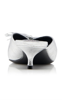 Renowned for their sleek, fluid lines and statement-making garnishes, Balenciaga’s meticulously crafted accessories always have the right amount of edge. Each piece either pays homage to legendary house signatures or displays fresh, out-of-the-box innovation—oftentimes, simultaneously. Designed to elongate your legs, Balenciaga's 'Knife' mules have angular heel counters and sharply pointed toes. They're made from laminated leather embellished with a coquettish bow. The signature 'Ice Pick' kitten heel will add just the right amount of height. PRODUCT DETAILS - Heel height measures approximately 40mm/ 2" - Slip on - Composition: metallic leather - Made in Italy