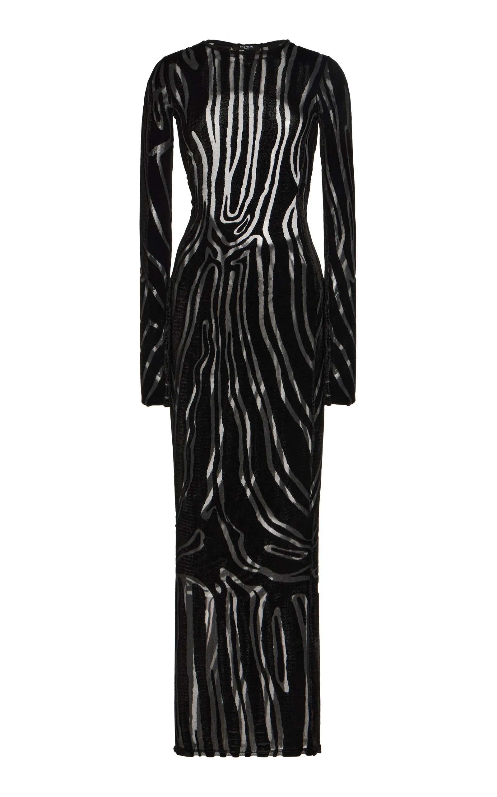 While Balmain has roots in Old Hollywood, its modern iteration is decidedly more edgy. Now helmed by creative director Olivier Rousteing, the designer aims to infuse the iconic brand’s signature Parisian style into each collection. Made from zebra-patterned velvet devore, this maxi has a bodycon silhouette with a cutout back. PRODUCT DETAILS - Fall '25 - Slip on - Composition: 89% viscose, 11% elastane - Dry clean - Made in France SIZE & FIT - Our model is wearing a size 1 - Model is 5’10” with a 31” bust, 23.5” waist, and 33.5” hip
