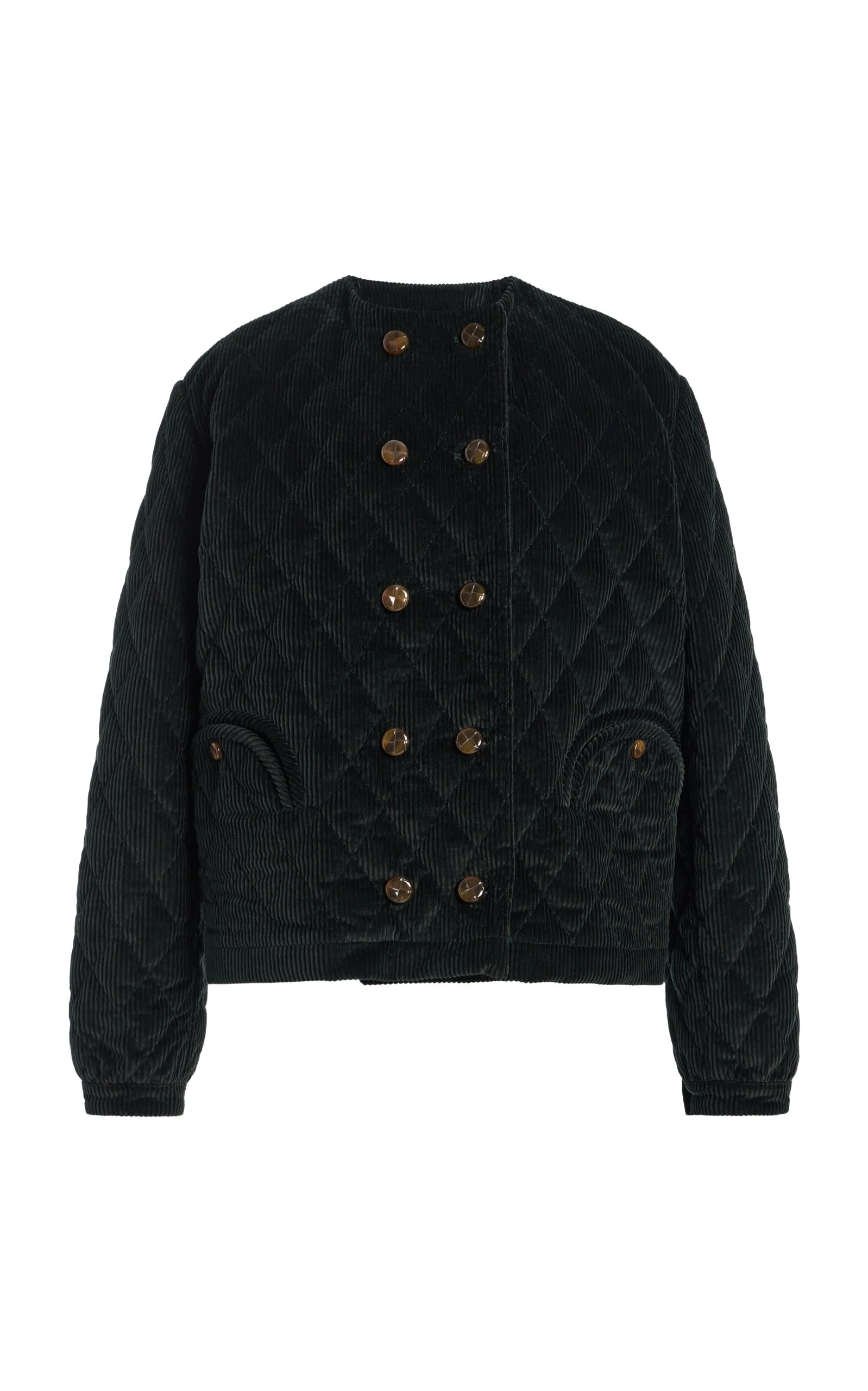 Blazers are a wardrobe essential—and those by the Milan-based trio of former fashion editors have been honed and perfected, season after season, to ensure they're a cut above the rest. Whichever you choose—you can’t go wrong. Quenie is a double-breasted bolero jacket in forest green quilted corduroy. PRODUCT DETAILS - Resort '26 - Button fastening - Composition: 100% cotton - Designer color: Forest - Dry clean - Imported SIZE & FIT - Designed for an oversized silhouette. For a more precise fit, we recommend selecting one size smaller than your usual.