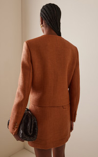 Blazers are a wardrobe essential—and those by the Milan-based trio of former fashion editors have been honed and perfected, season after season, to ensure they're a cut above the rest. Whichever you choose—you can’t go wrong. The hip-grazing 'Shamo' is woven into subtle horizontal stripes from a textured cotton blend. The lapel-less style has a cropped design with lightly padded shoulders and signature "Smiley" pockets. Pair with the matching mini skirt for a seasonal suit. PRODUCT DETAILS - Pre-Fall '25 - Button fastening - Composition: 82% cotton, 18% polyamide - Designer color: Peanut - Dry clean - Made in Italy SIZE & FIT - Designed for a slim fit