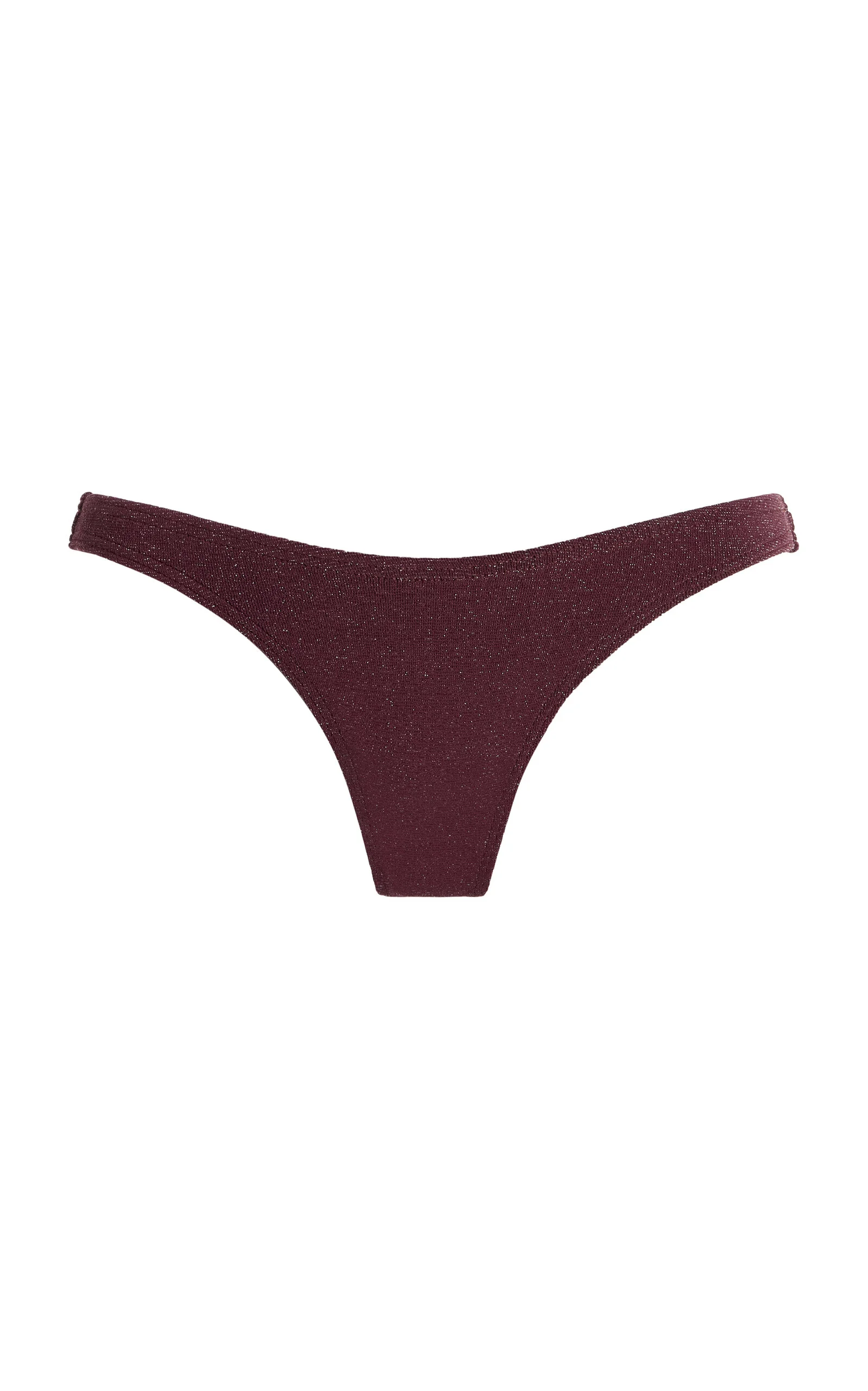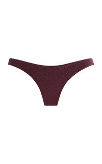 Bond-Eye is the embodiment of the iconic Australian summer spirit. Designed and handmade in Bondi, the label crafts considered and flattering swimwear from the signature one-size tubular crinkled fabric made famous in the 80s. These ‘Scene’ briefs are made from a berry-toned, metallic lurex to match its corresponding bikini top. It has a low-rise waist and medium coverage. PRODUCT DETAILS - Resort ‘26 - Slip on - Composition: 85% nylon, 10% lurex®, 5% Lycra - Hand wash - Designer Color: Amarena - Made in Australia SIZE & FIT - One size only. This style comfortably fits those who are between a size XSmall-Large - Model is 5'9.5" with a 32" bust, 24" waist, and 35.5" hip