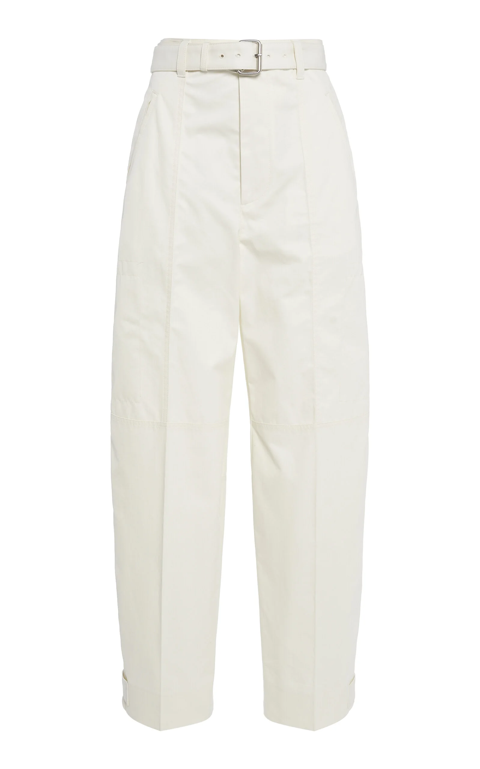 Bottega Veneta (meaning "Venetian Artisanal Workshop" in its native Italian) unites different people, ideas, and perspectives with an unwavering commitment to excellence and a unique vision of luxury. With solid foundation, each season builds off the other, delivering new iterations of coveted house signatures with contemporary, yet timeless, flare. Crafted from crisp cotton, these pants are tailored with a subtle barrel leg finished with cuffs and a belted waist. PRODUCT DETAILS - Pre-Fall '25 - Concealed zip and hook fastening - Composition: 100% Cotton - Designer color: Frosting - Dry clean - Made in Italy SIZE & FIT - Designed for a relaxed fit
