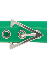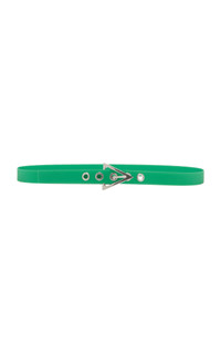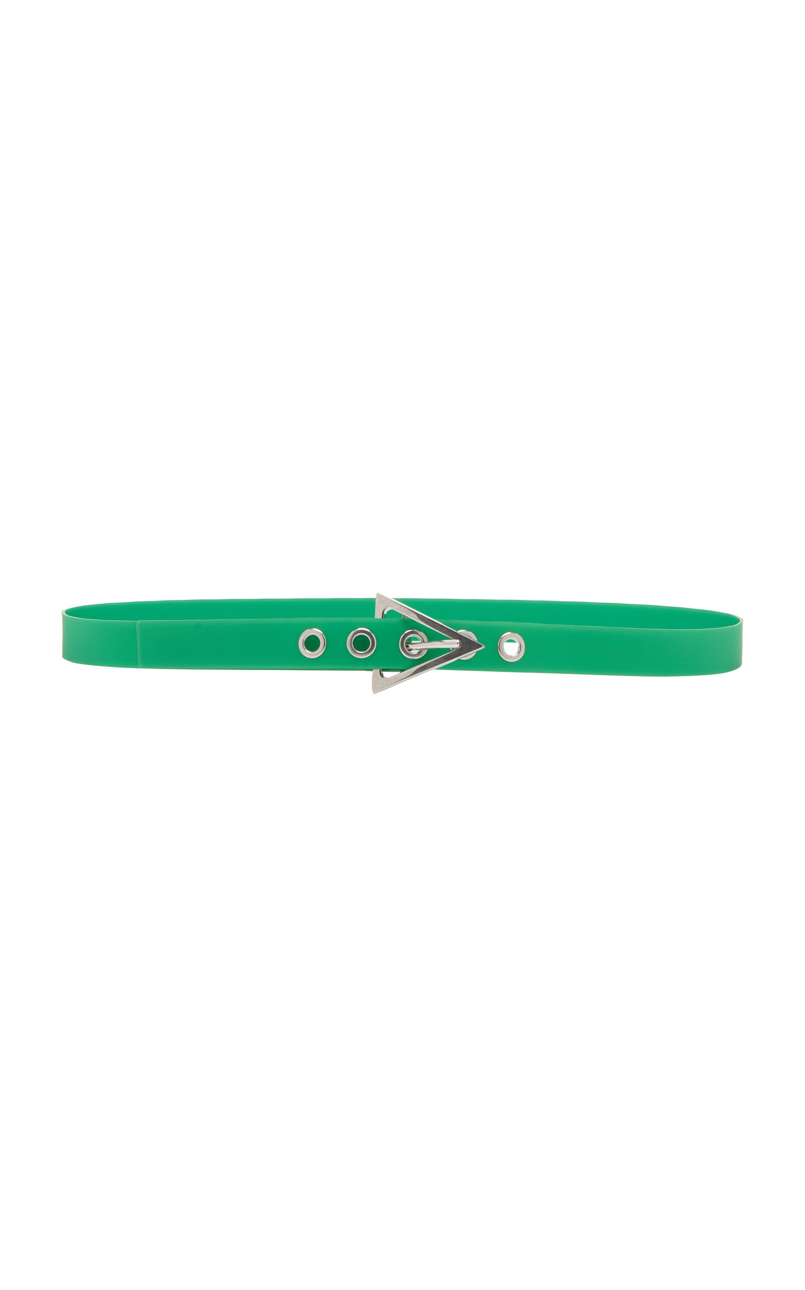 Defined by a triangular-shaped silver-tone buckle, this Bottega Veneta belt subtly nods to house codes. It's been crafted in Italy from gummy matte rubber into a skinny silhouette that works on either the waist or hip. PRODUCT DETAILS - Buckle fastening - Composition: rubber - Designer color: Parakeet - Made in Italy SIZE & FIT - This item's width measures 1"