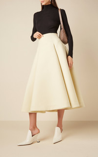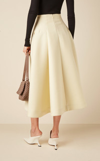 For Bottega Veneta's Fall '23 show, Matthieu Blazy delivered with a collection that ups the fashion ante while simultaneously delivering real-life wearability. Tailored from compact-knit wool, this mid-length skirt features a contoured high-rise waist that falls to a full A-line silhouette with folds that add plenty of volume. Wear it with a simple sweater or tee. PRODUCT DETAILS - Concealed zip fastening along back - Composition: 100% wool - Designer color Chamomile - Dry clean - Made in Italy SIZE & FIT - Fits large to size, our fit specialist recommends taking one size down