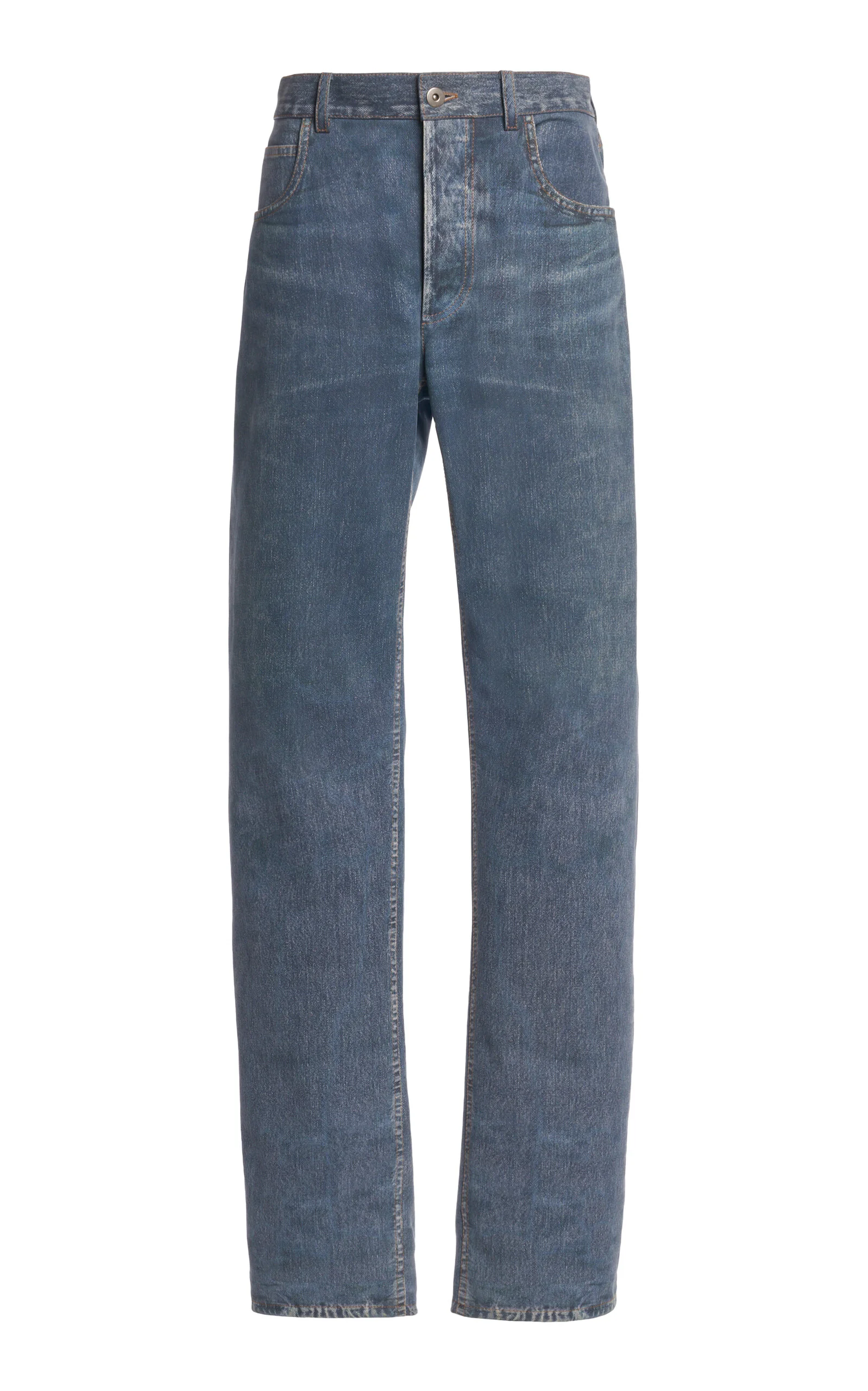 Since his debut, designer Matthieu Blazy has leaned into Bottega Veneta's foundations, delivering new iterations of house signatures. Though giving the illusion of denim, these zip fastened trousers are made entirely of nappa leather, featuring a column leg silhouette, high waist, and belt looping. Style as elevated day wear with heeled boots and the mini 'Jodie' bag from the brand. PRODUCT DETAILS - Concealed zip fastening - Composition: nappa leather - Specialist clean - Made in Italy SIZE & FIT - Model is wearing a size IT 38 - Fits true to size, our fit specialist recommends taking your normal size - Designed for a relaxed fit