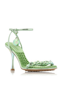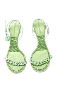From glossy separates to sequin party pieces, as well as updates on their cult hit accessories, Bottega Veneta's latest serves as a reminder of the pleasures to be found in dressing up again. Set atop rubber-dotted soles for traction, these 'Metallized' sandals feature an ankle strap and chainlink detail across the vamp. Show off yours with cropped hems and a 'Pouch' bag from the brand. PRODUCT DETAILS - Heel height measures approximately 90mm/ 3.5 inches - Buckle fastening - Composition: lambskin leather - Made in Italy
