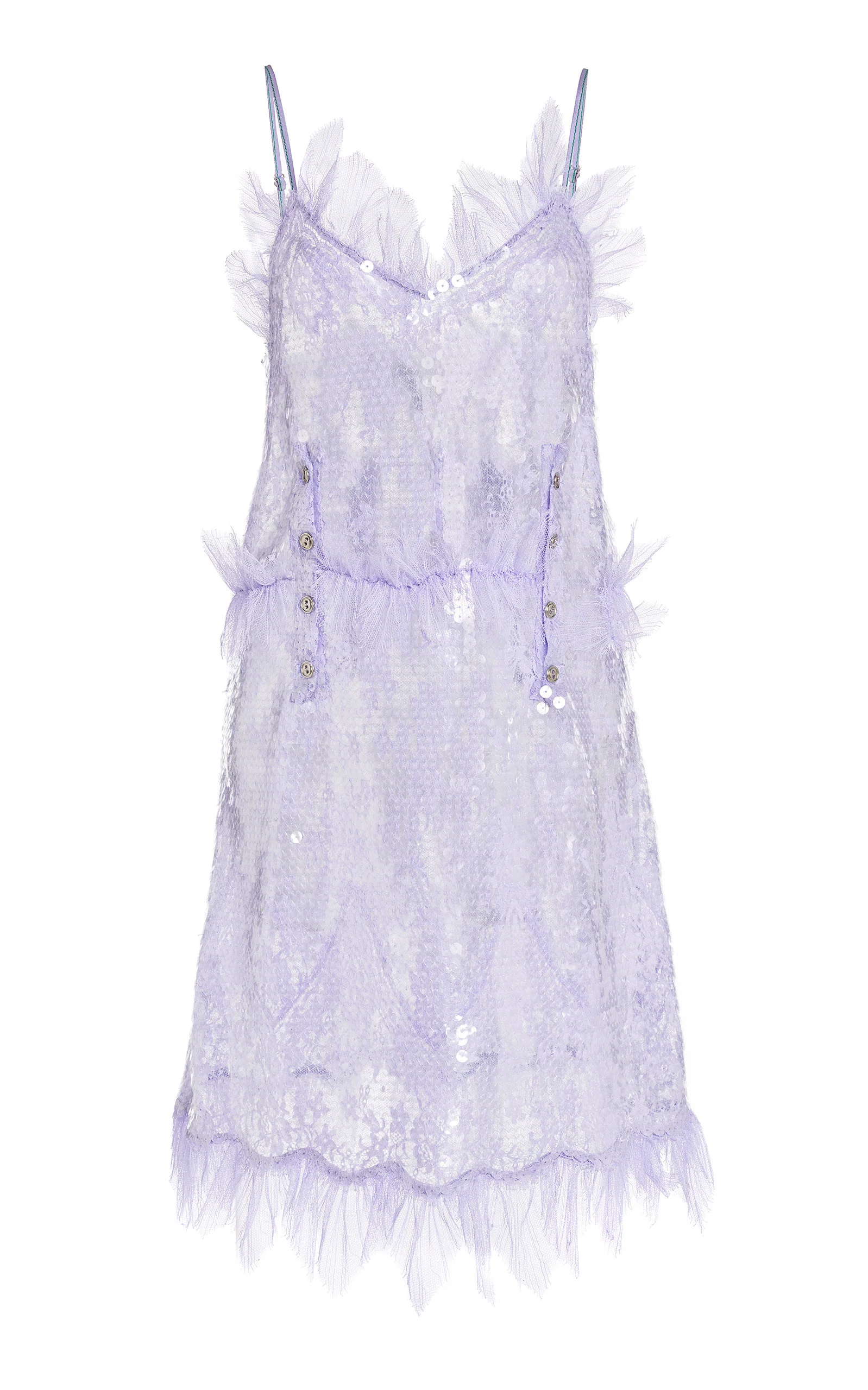 Fall '22 marks Matthieu Blazy's official debut as the Italian label's creative director (he was formerly the ready-to-wear director after stints at Balenciaga, Calvin Klein, and Celine). Leaning into the brand's foundations, he delivers new iterations of house signatures. Fringe and sparkle bring textural intrigue to occasionwear, while apparent basics are actually anything but. This slip has a looser fit made made from sheer lace decorated with clear sequins, ruffled tulle, and silver buttons. Try it with the label's coveted 'Stretch' sandals. PRODUCT DETAILS - Slip on - Composition: 63% cotton, 37% pollimade - Dry clean - Made in Italy SIZE & FIT - Model is wearing a size IT 38 - Fits true to size, our fit specialist recommends taking your normal size - Designed for a relaxed fit