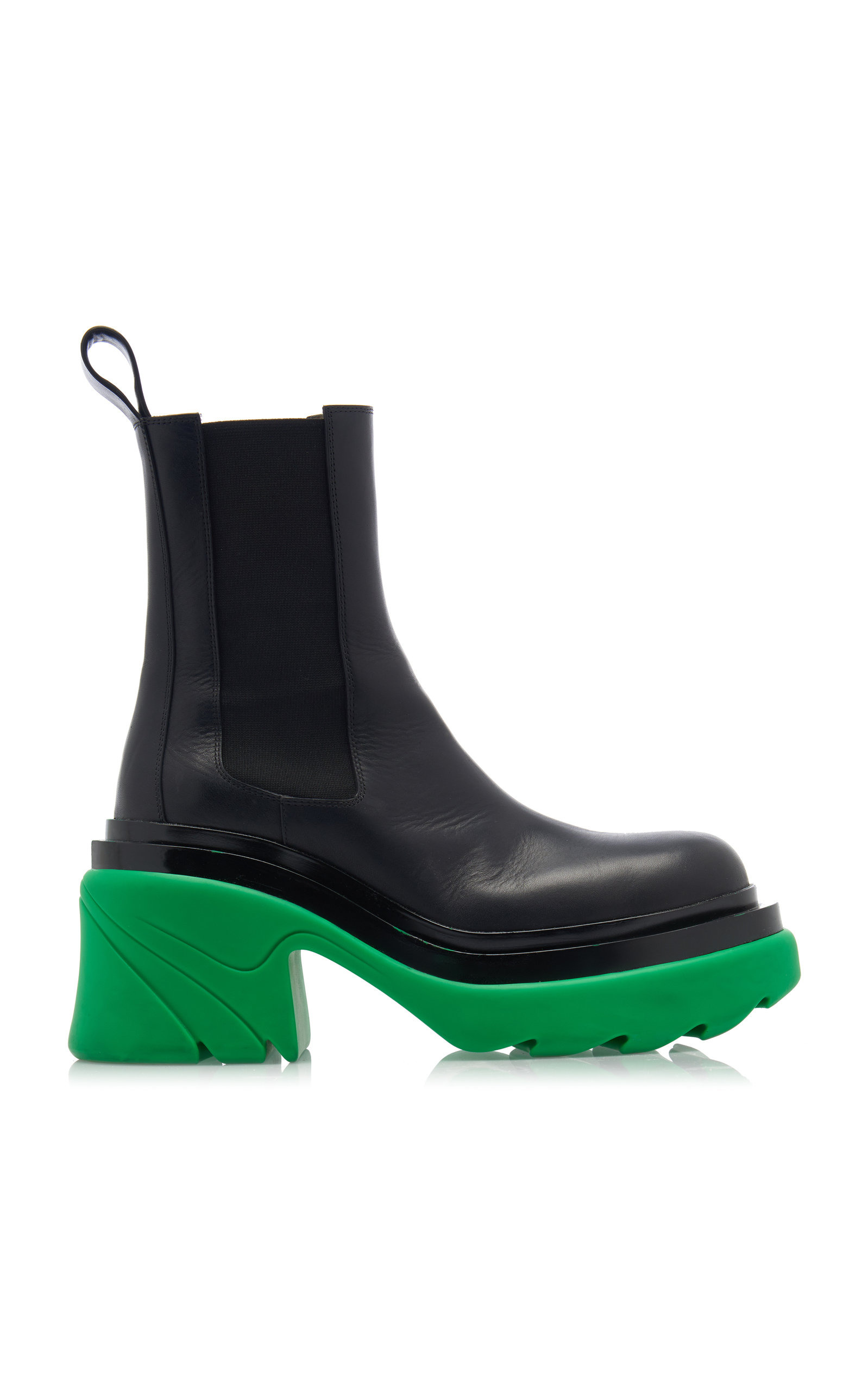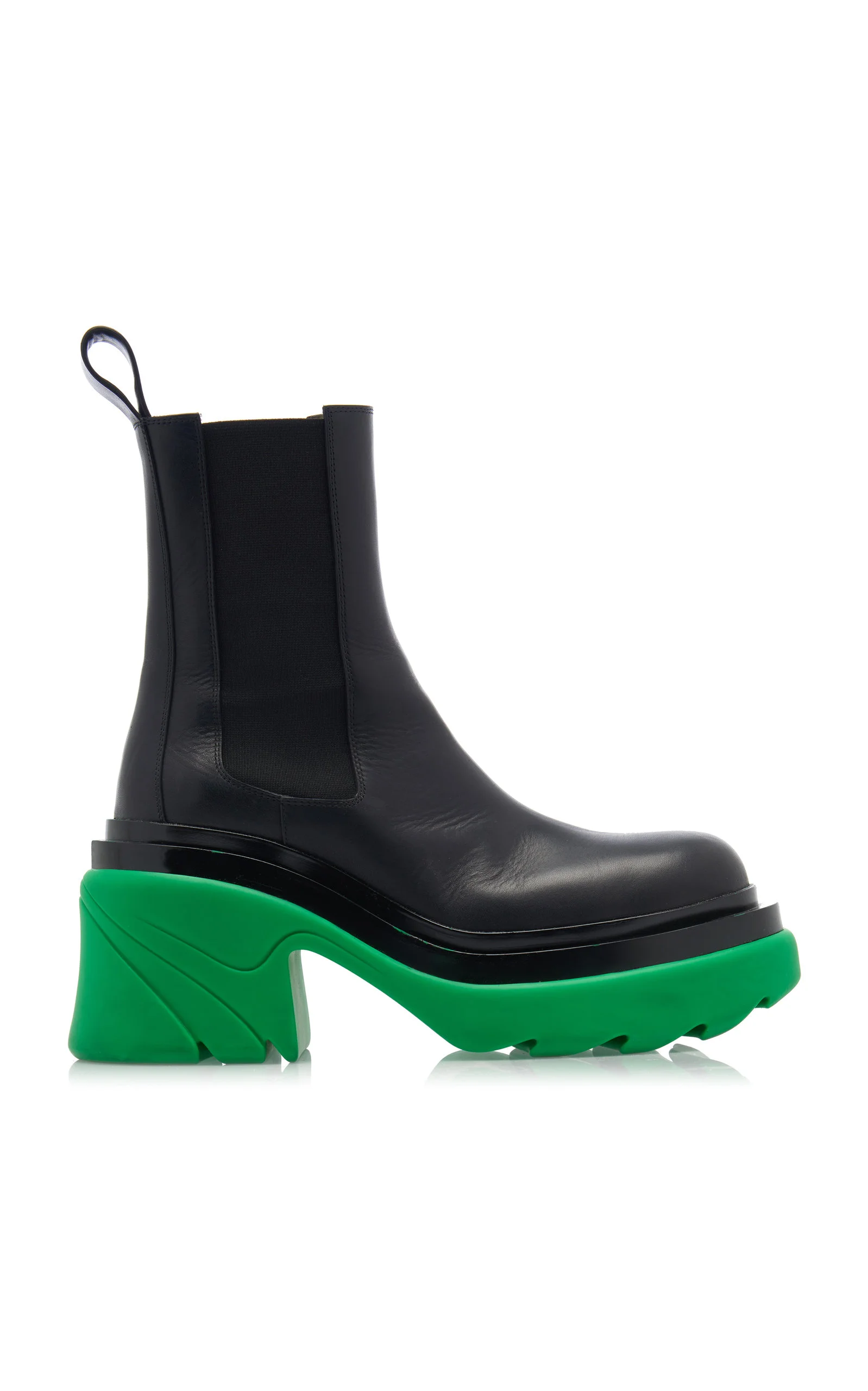 From knitted suiting sets to a colorful update on cult hit accessories, Bottega Veneta's newest collection puts a high fashion lens on everyday luxury — one that's ready for a new reality. Building on the now-signature stompy boot, this military-inspired pair is made from smooth calfskin leather set atop on-trend chunky heeled rubber lug soles in Bottega green. Pair with the 'Pouch' bag in a matching shade. PRODUCT DETAILS - Heel height measures approximately 3.7 inches - Pull on - Composition: calfskin leather - Designer color: Grass - Made in Italy