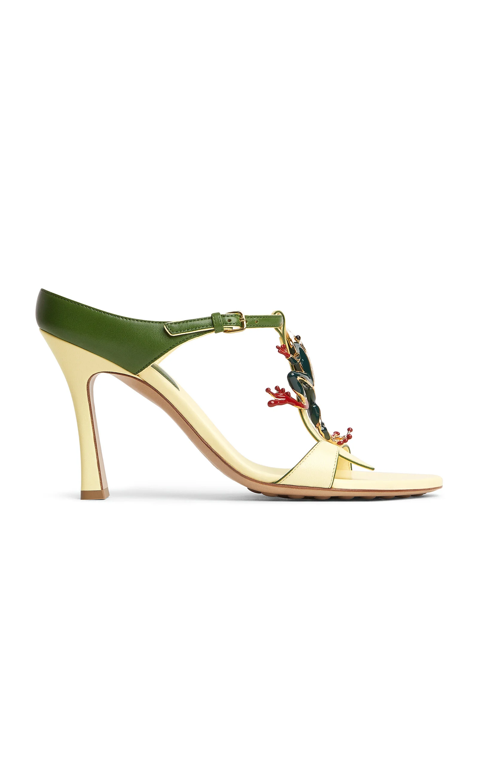Since his debut, designer Matthieu Blazy has leaned into Bottega Veneta's foundations, delivering new iterations of brand signatures. Crafted in Italy from supple nappa leather, these strappy mule sandals are embellished with a playful frog motif. PRODUCT DETAILS - Heel height measures approximately 90mm/ 3.5" - Buckle fastening - Composition: nappa leather - Made in Italy