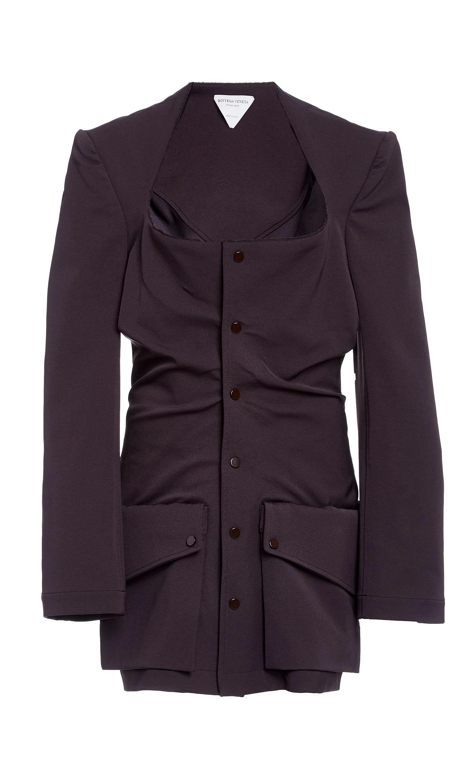 Made with the same eye-catching details that set Bottega Veneta apart, this revived wardrobe staple is bound to become a favorite among the sartorial set. Crafted from gathered gabardine, it's designed with oversized front pockets and a sculptural square neckline in a rich chocolate hue. Team yours with the coordinating trousers for both work and play. PRODUCT DETAILS - Snap fastenings through front - Composition: 89% polyamide, 11% elastane - Dry clean - Made in Italy