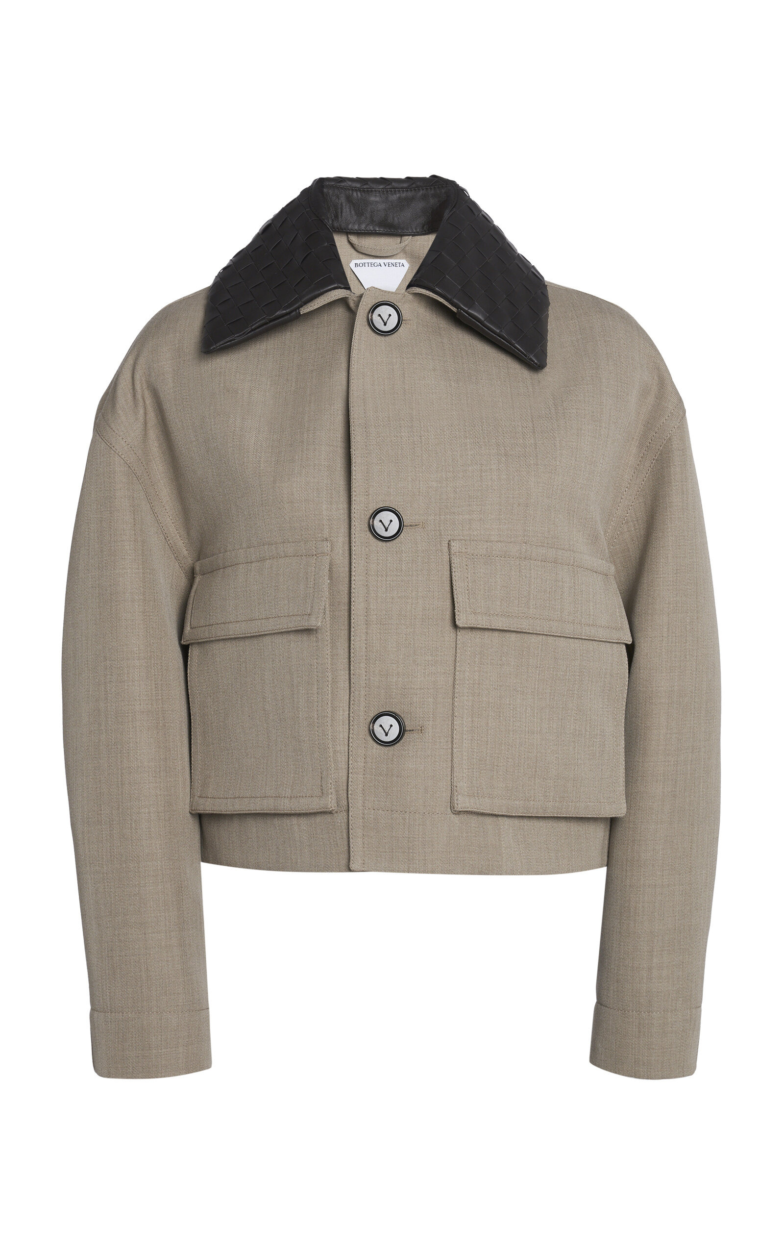 Bottega Veneta (meaning "Venetian Artisanal Workshop" in its native Italian) unites different people, ideas, and perspectives with an unwavering commitment to excellence and a unique vision of luxury. With solid foundation, each season builds off the other, delivering new iterations of coveted house signatures with contemporary, yet timeless, flare. This cropped jacket has a relaxed fit tailored from soft wool twill. The removable collar is made from intrecciato-woven leather — a nod to house codes. PRODUCT DETAILS - Fall '25 - Button fastening - Composition: 100% wool - Dry clean - Made in Italy