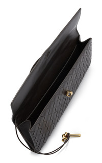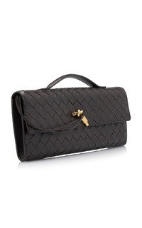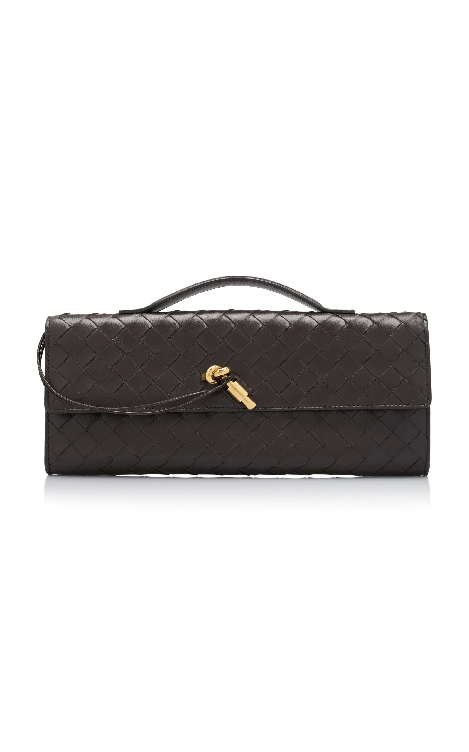 Since his debut, designer Matthieu Blazy has leaned into Bottega Veneta's foundations, delivering new iterations of brand signatures. Showcasing the trademark intrecciato weave, this top handle clutch has a long, slim profile topped with a polished brass knot that nods to house codes. It's sized just right to fit your phone and a few essentials. PRODUCT DETAILS - Clasp fastening - Composition: leather - Designer color: Fondant - Made in Italy SIZE & FIT - This item measures approximately 13 x 31 x 3cm/ 5 x 12 x 1"