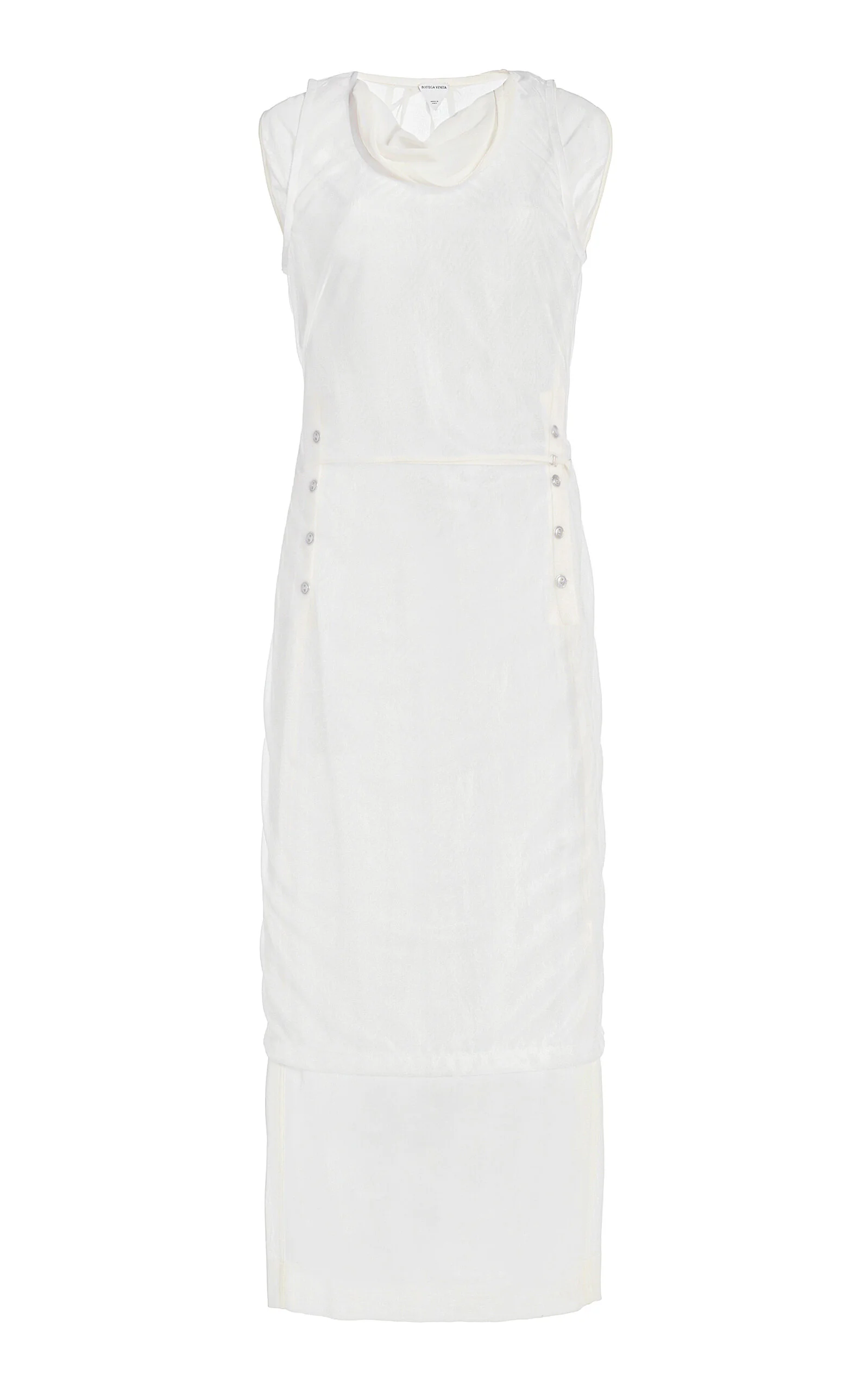 Since his debut, designer Matthieu Blazy has leaned into Bottega Veneta's foundations, delivering new iterations of house signatures. Crafted from layered, semi-sheer cotton, this relaxed, fit-and-flare dress features a cowl neckline, metallic embellishments, and a midi hem. It's classic, but elevated silhouette make it a versatile day wear piece. Style yours with a leather clutch from the label. PRODUCT DETAILS - Tie fastenings - Composition: 100% cotton - Dry clean - Made in Italy SIZE & FIT - Model is wearing a size US 2 - Fits true to size, our fit specialist recommends taking your normal size - Designed for a slim fit