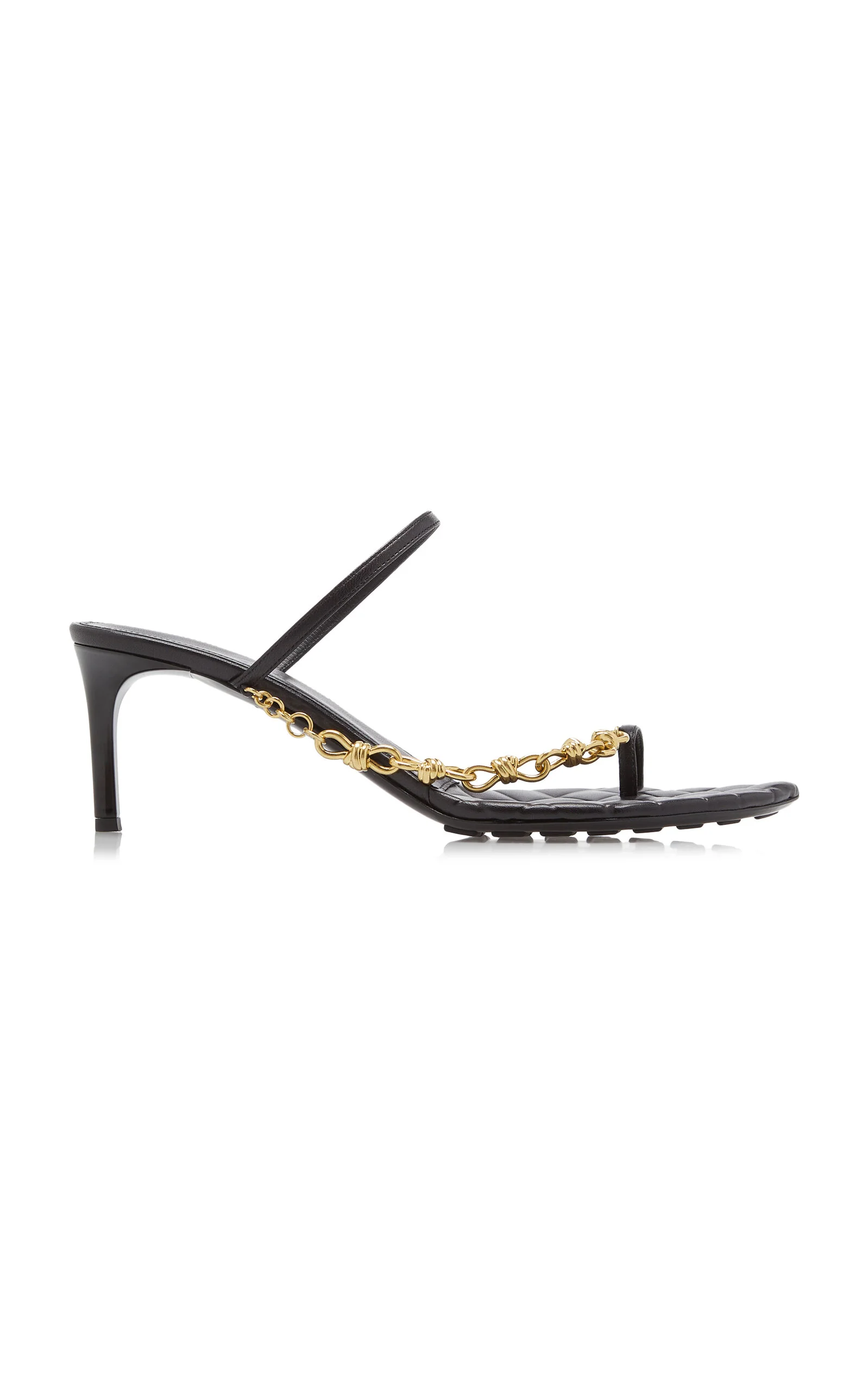 Since his debut, designer Matthieu Blazy has leaned into Bottega Veneta's foundations, delivering new iterations of house signatures. Made from soft lambskin, the 'Leaf' sandal features a gold-plated metal chain with signature knots, a high frequency insole with Intreccio pattern and an asymmetric almond toe shape. PRODUCT DETAILS - Resort '24 - Heel height measures 60mm/ 2.35" - Slip on - Composition: lambskin leather - Made in Italy