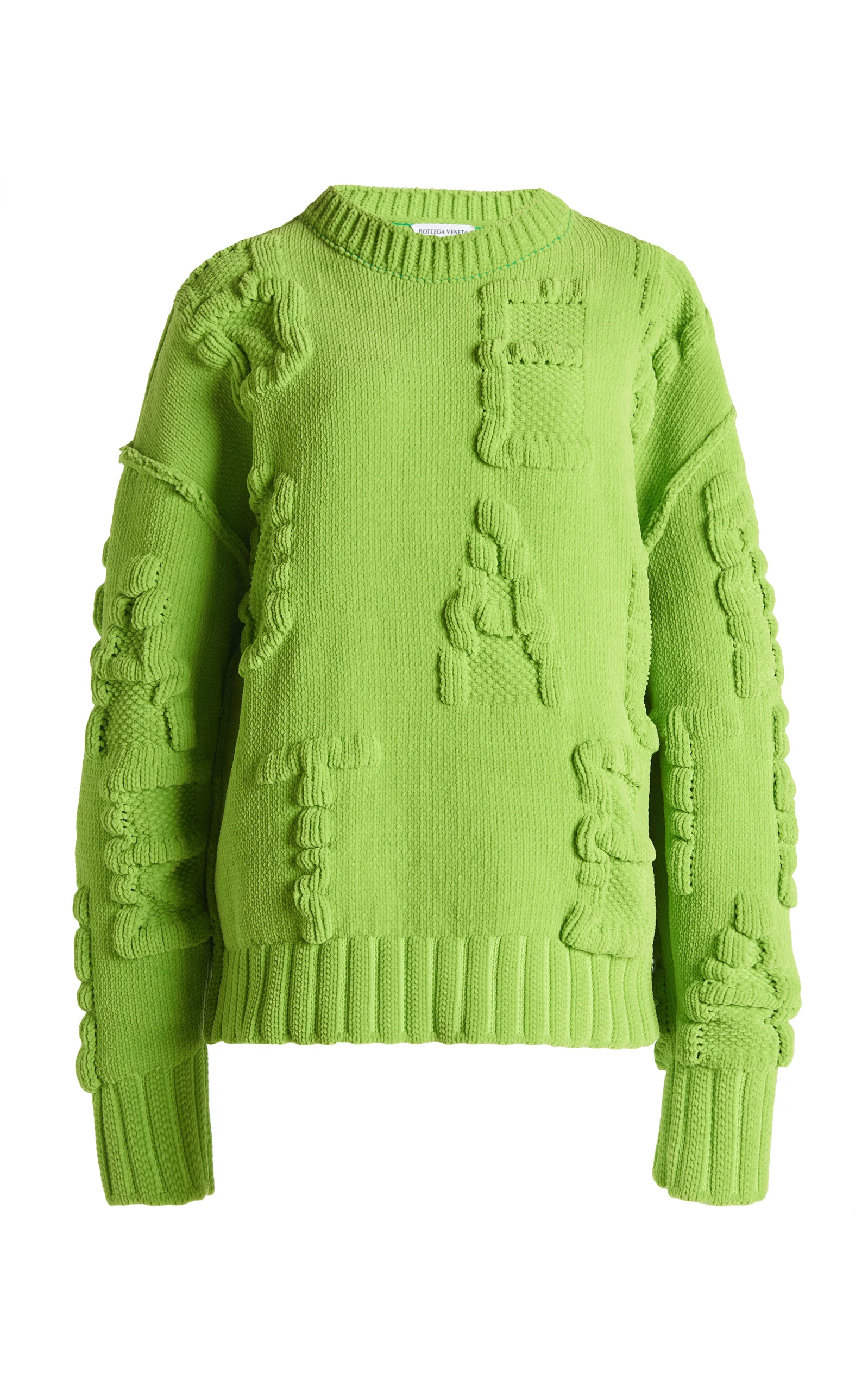 From knitted suiting sets to a colorful update on cult hit accessories, Bottega Veneta's latest 'Wardrobe' collection serves as a reminder of the pleasures to be found in dressing up again. Made from brightly colored chenille, this crewneck sweater is jacquard-woven with large logo lettering. Dress it down with denim or go out for the evening with a slinky slip skirt. PRODUCT DETAILS - Slip on - Composition: 98% polyamide, 1% polyester, 1% elastane - Designer color: Caterpillar - Dry clean - Made in Italy SIZE & FIT - Our model is 180cm/ 5'11" and wearing a size Small - Fits true to size, our fit specialist recommends taking your normal size