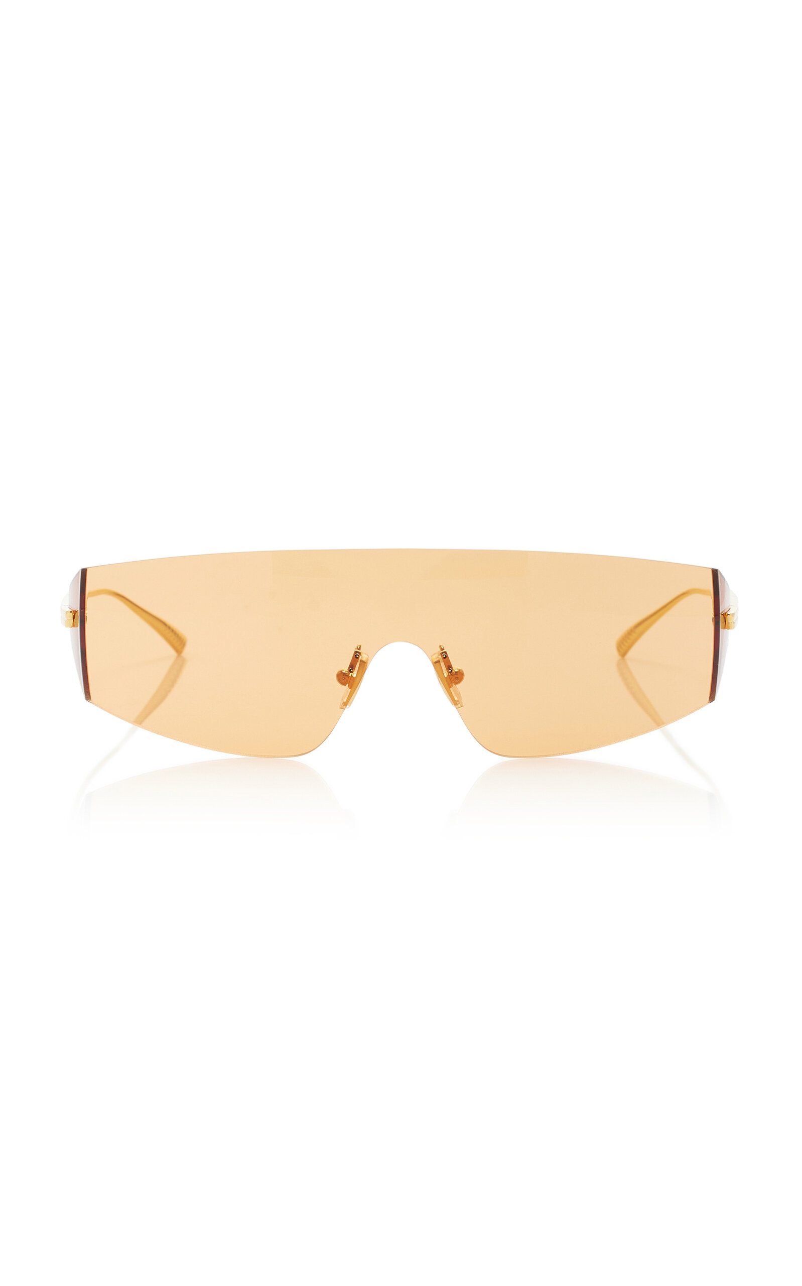 Bottega Veneta's eyewear collection reimagines iconic silhouettes in bold new volumes. These frames have a mask silhouette crafted from gold-tone metal that nods to the house's ribbon hardware. The orange-tinted lenses are crafted from renewable bio-nylon to reduce its environmental impact. PRODUCT DETAILS - Composition: acetate, bio-nylon - 100% UVA/UVB protection - Made in Italy