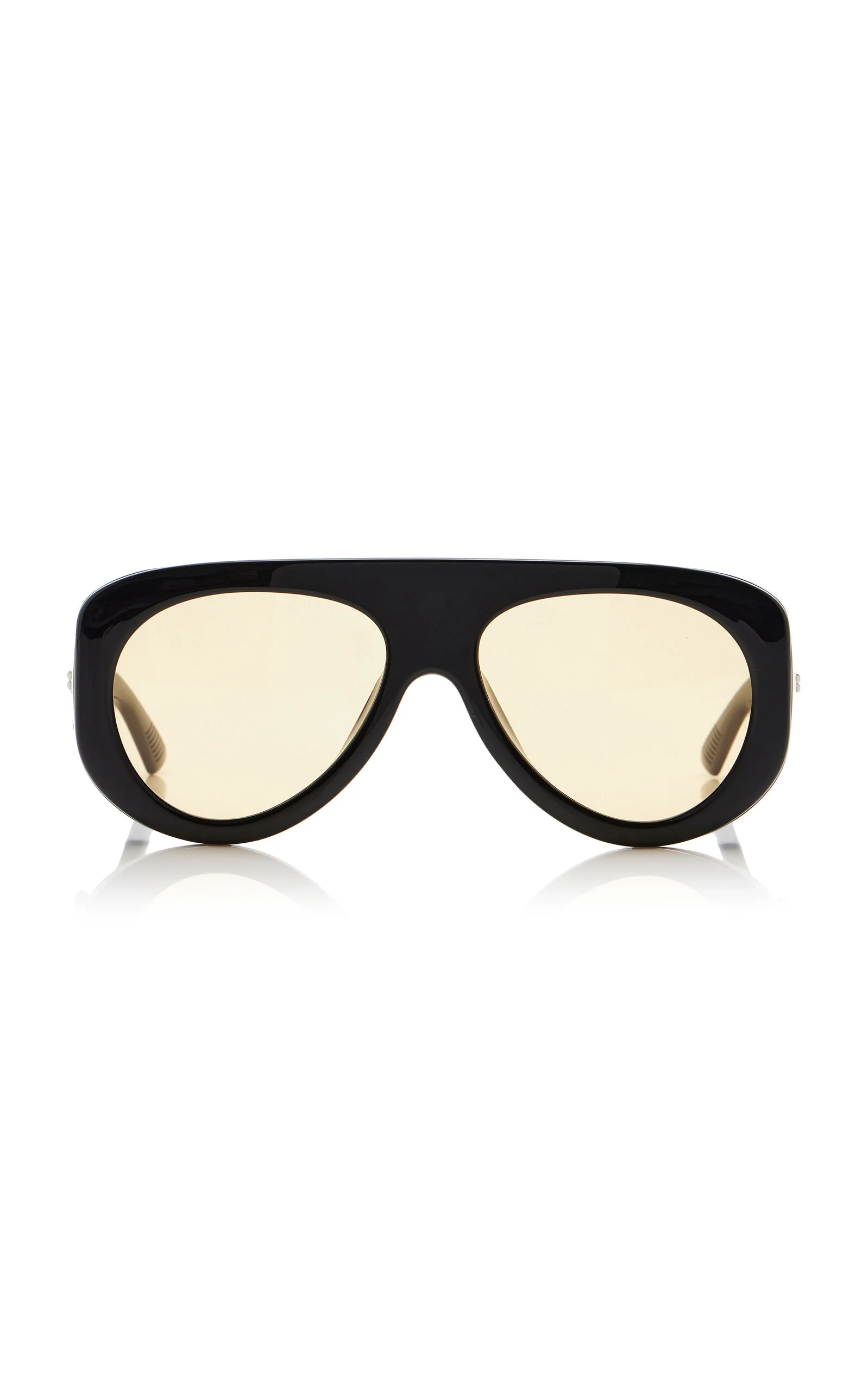 Bottega Veneta's eyewear collection reimagines iconic silhouettes in bold new volumes. This 'Osservatorio' has chunky pilot frames made from glossy black acetate with a spoiler to protect the face from the sun. The orange lenses are crafted from renewable bio-nylon that reduces this pair's environmental impact. PRODUCT DETAILS - Composition: injected acetate, polyamide lens with 39% bio-based content - 100% UVA/ UBV protection - Made in Japan