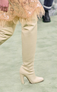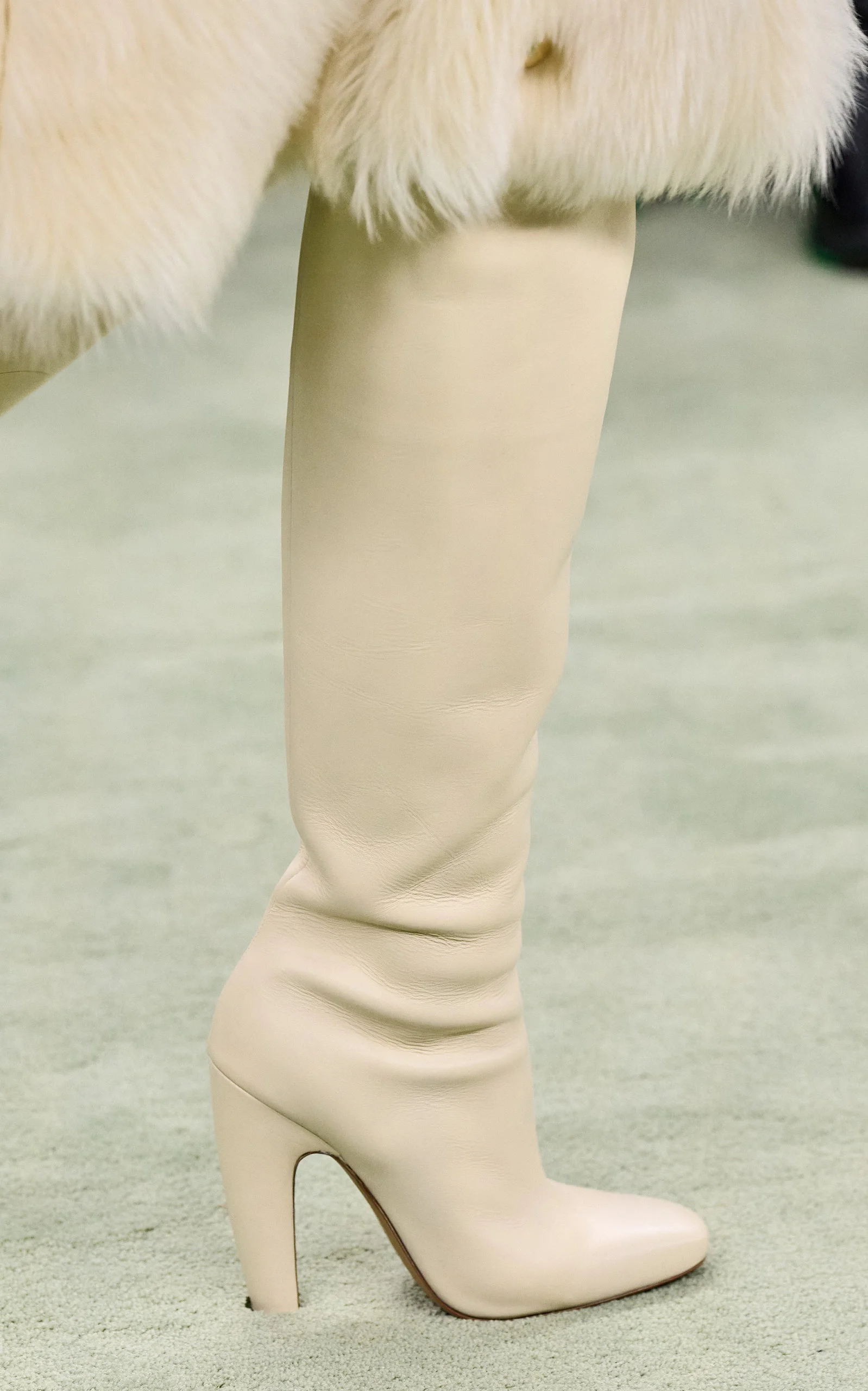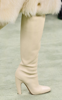 PRODUCT DETAILS - Over-the-knee boot silhouette, calf leather body, pointed toe, tapered heel - Zipper fastening - Composition: V2DY0 veneta calf - Professionally clean - Made in Italy SIZE & FIT - Heel height measures approximately 4"