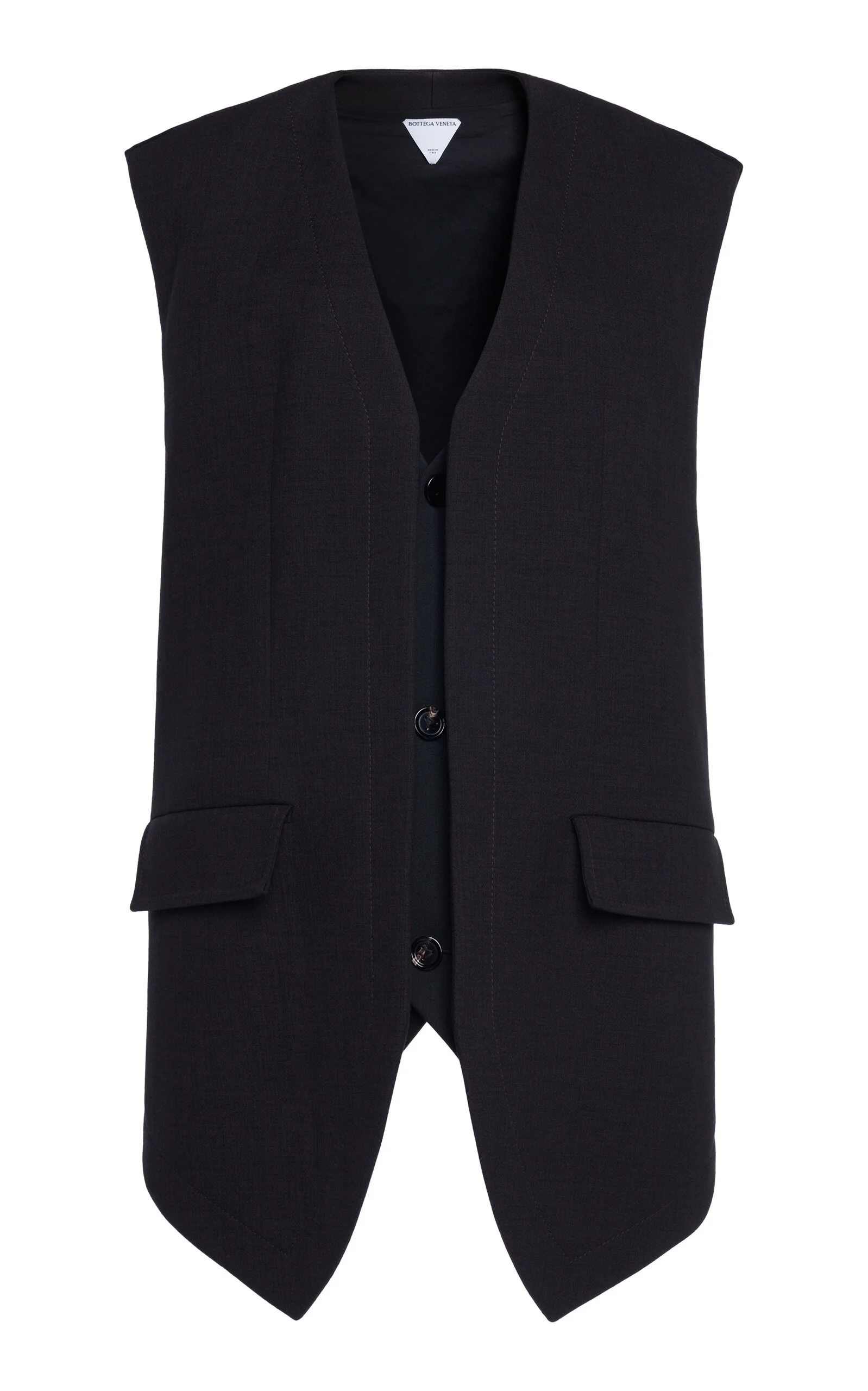 Stepping away from reinventing house codes, Bottega Veneta Creative Director Matthieu Blazy left Italy in search of inspiration for Spring '24. "The idea was blending worlds. We took inspiration literally from all around the world: South America, Southeast Asia, Russia, Brittany, Sicily . . . we tried to blend them to create some kind of new culture," he told Vogue of the collection. Made from a stretchy cotton-blend melange suiting weave, this vest has a boxy, oversized fit with a layered effect through the front. Pair it with the matching pant for a sleek take on suiting. PRODUCT DETAILS - Spring '24 - Button fastenings at front - Composition: 67% cotton, 29% viscose, 4% polyamide - Designer color: Fondant/ Black - Dry clean - Made in Italy SIZE & FIT - Our model is 178cm/ 5'10" and wearing a size IT 38 - Designed for an oversized fit