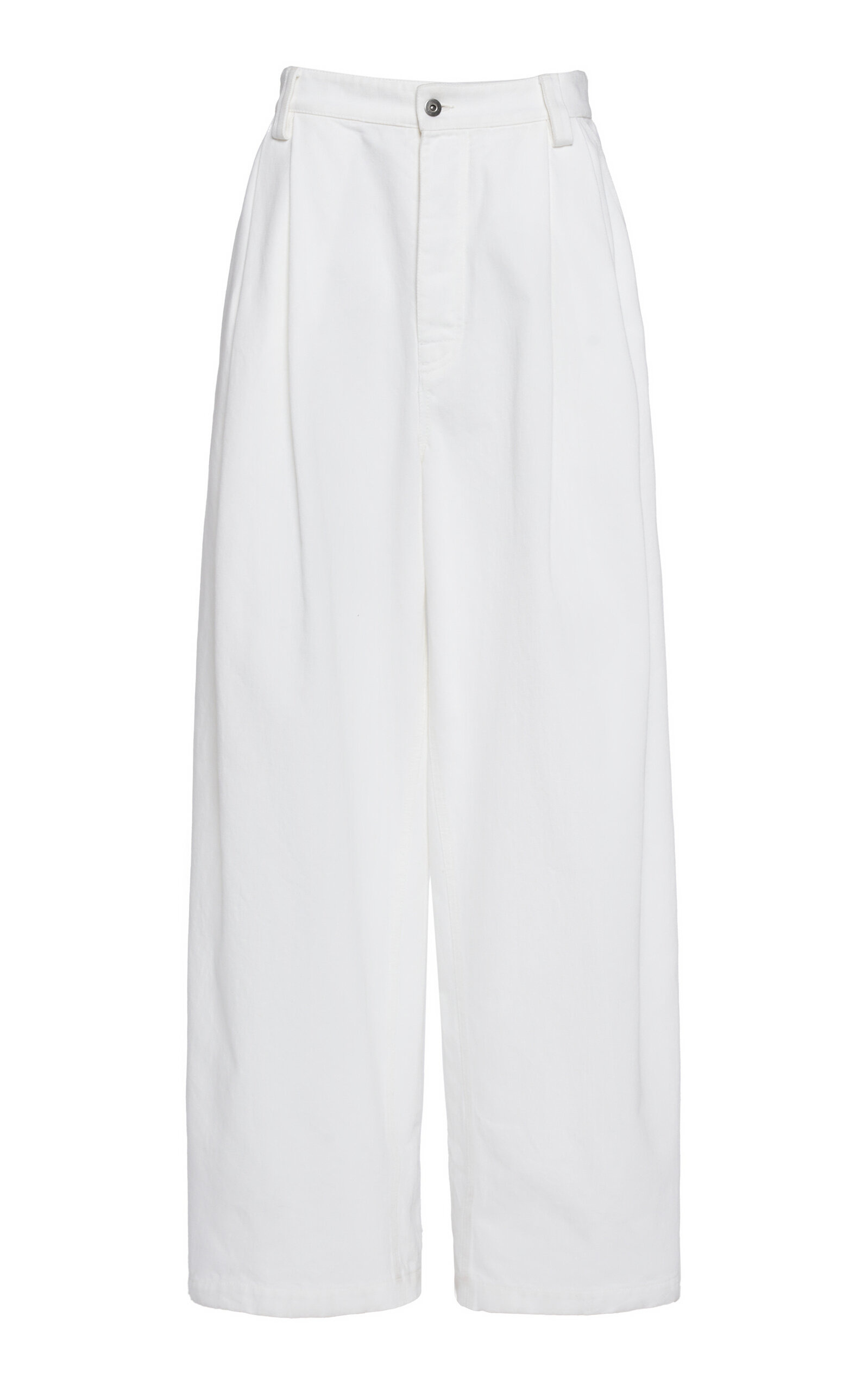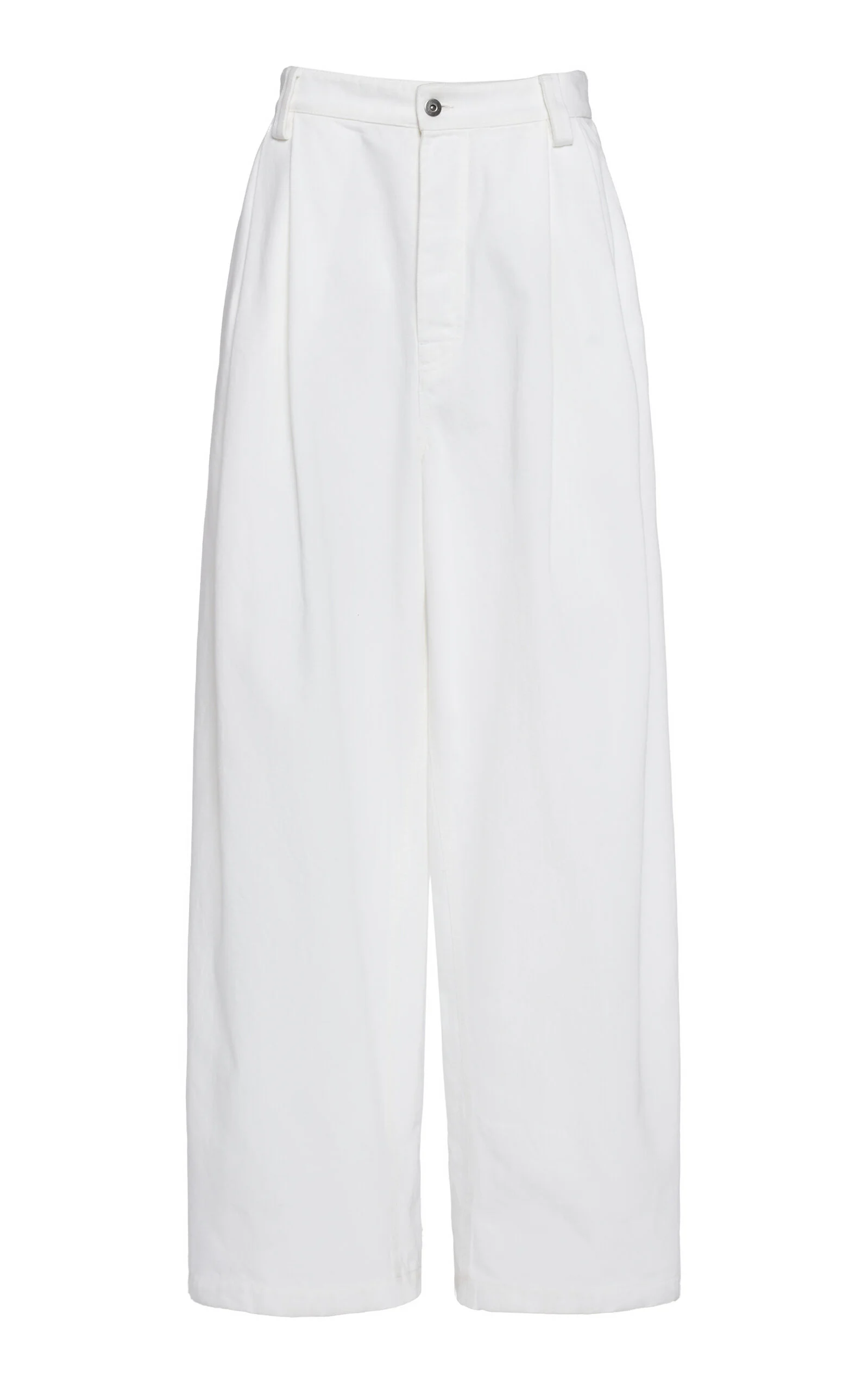 Designer Matthieu Blazy has leaned into Bottega Veneta's foundations, delivering wearable iterations of house signatures. Cut from non-stretch cotton denim, these casual trousers have relaxed, wide legs and a pleated waistband that sits high above the waist. The green logo patch at the back nods to house codes. PRODUCT DETAILS - Button and concealed zip fastening along front - Composition: 100% cotton - Dry clean - Made in Italy SIZE & FIT - Our model is 181cm/ 5'11" and wearing a size IT 38 - Designed for a slim fit
