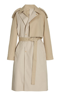 Bottega Veneta is constantly reinventing classic silhouette; take note of this trench coat designed with removable sleeves. Made from a blend of neutral cotton into a loose-fitting shape, this outerwear option is both parts traditional and innovative. Cinch your figure with the waist belt. PRODUCT DETAILS - Tie waist fastening - Composition: 65% polyester, 35% cotton - Made in Italy SIZE & FIT - Fits true to size, our fit specialist recommends taking your normal size