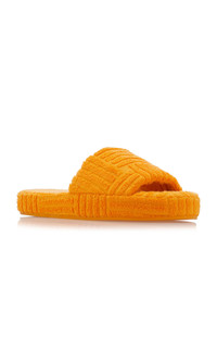 More than just the show's location, Detroit permeated Bottega Veneta's latest runway. With glossy updates on the label's ever popular footwear and industrial accents throughout, Spring '22 took full inspiration from the motor city's remarkable golden age. Bottega Veneta's 'Resort' slippers riff on the house's iconic intrecciato weave. They're made from soft and absorbent cotton terry cloth in a weave that mimics the technique. Don't be afraid to sport them outside the house. PRODUCT DETAILS - Heel and Platform height measures approximately 30mm/ 1.2" - Slip on - Composition: 100% cotton, rubber outsole - Designer color: Tangerine - Made in Italy