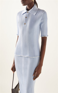 For Pre-Fall '24, Creative Director Matthieu Blazy found inspiration in the Bottega archives — when the house started making bags in the late ’60s and ’70s. This shirt has a classic polo silhouette made from a finely ribbed cotton with rolled edges. Pair it with the matching skirt. PRODUCT DETAILS - Pre-Fall '24 - Button fastenings along front - Composition: 100% cotton - Designer color: Bubble - Dry clean - Imported SIZE & FIT - Model is wearing a size Small - Designed for a slim fit