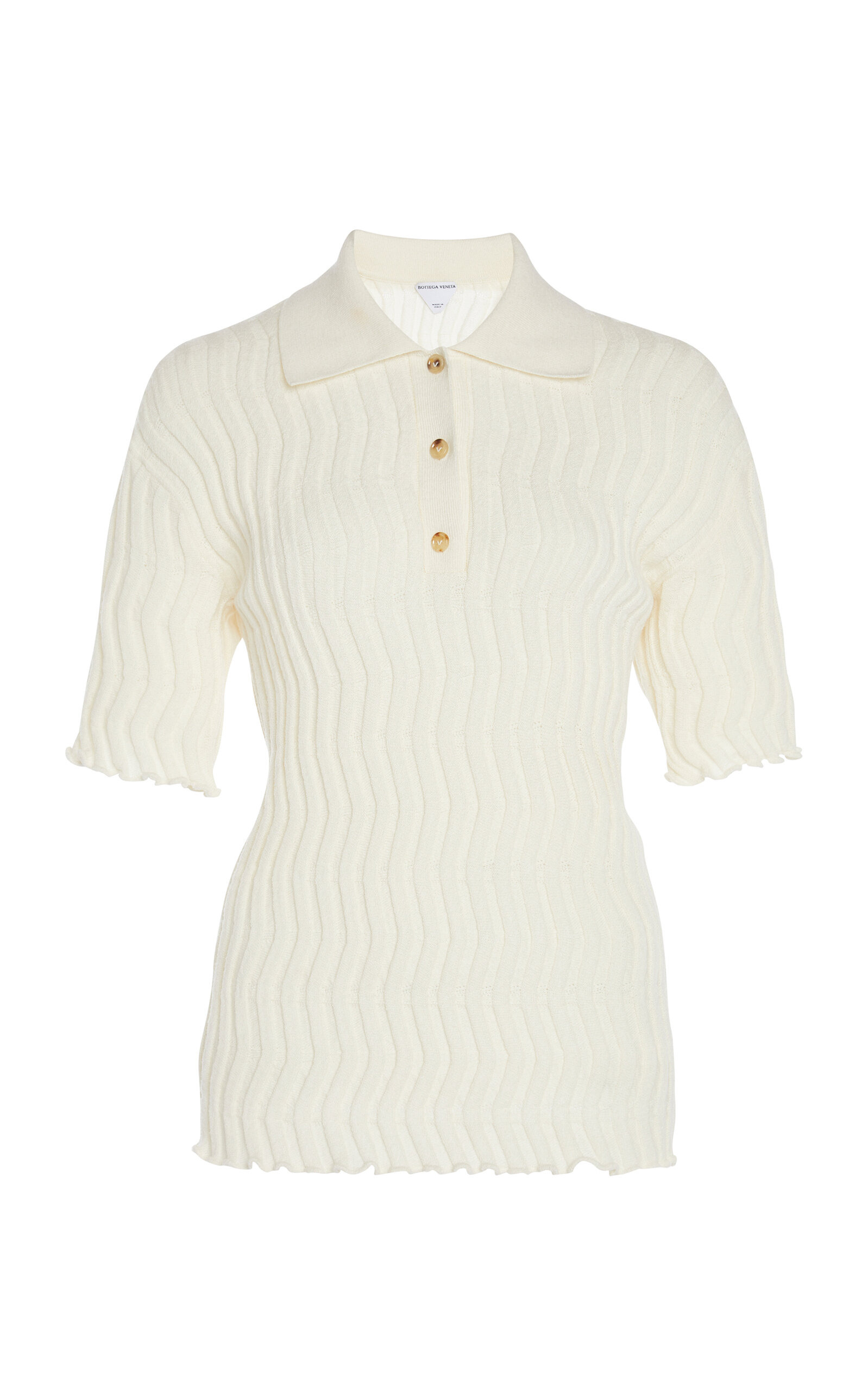 For Resort '25, Matthieu Blazy sets his sights on elevating the everyday — it is a lesson in balancing opulence and ease. This polo sweater is exquisitely crafted from a ribbed wool knit with a wavy texture. Wear it with the matching skirt. PRODUCT DETAILS - Resort '25 - Slip on - Composition: 100% wool - Designer color: String - Dry clean - Made in Italy SIZE & FIT - Designed for a slim fit