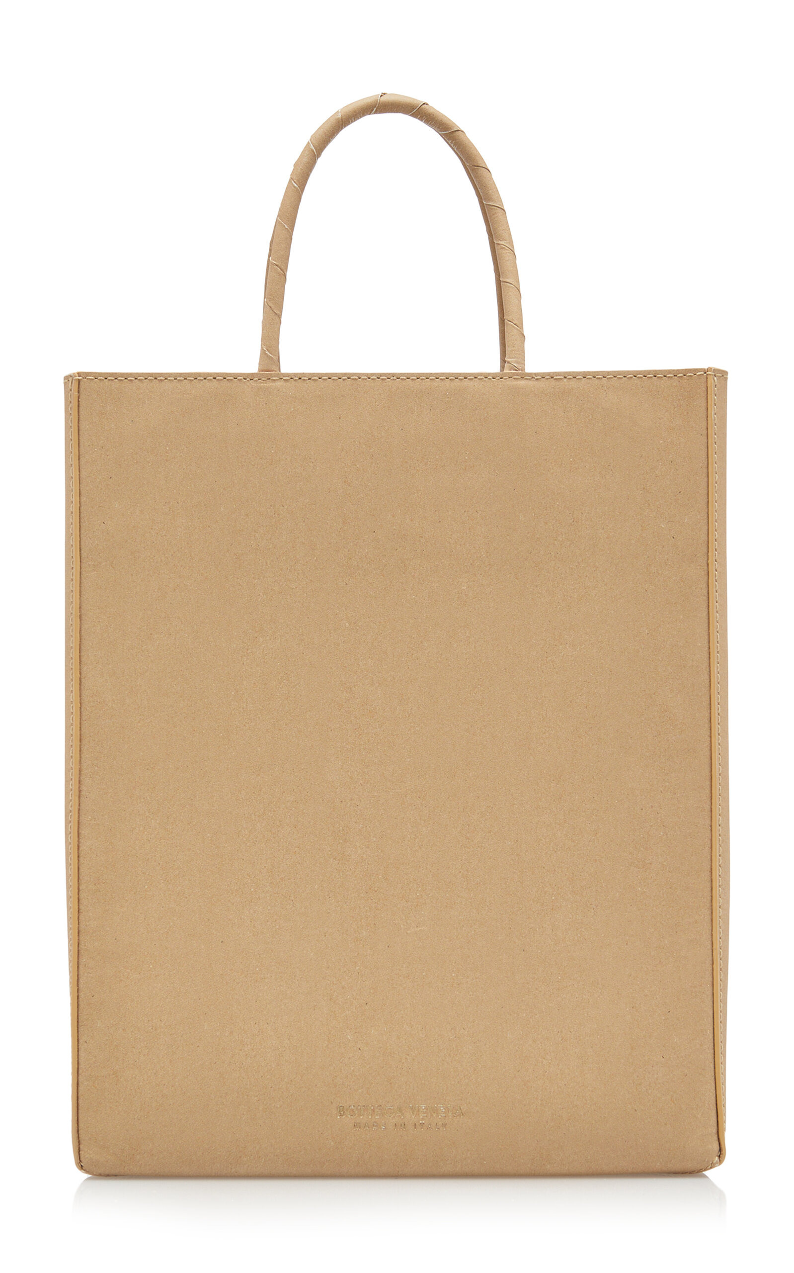 Since his debut, designer Matthieu Blazy has leaned into Bottega Veneta's foundations, delivering new iterations of house signatures. This tote has a North/South silhouette cleverly crafted from leather with a paper-like look and feel and a suede lining for structure. The wrapped handles mimic those found on shopping bags. PRODUCT DETAILS - Open top - Composition: borsa raw paper leather - Designer color: Kraft - Made in Italy SIZE & FIT - This item measures approximately 10.2 x 7.9 x 4.9"