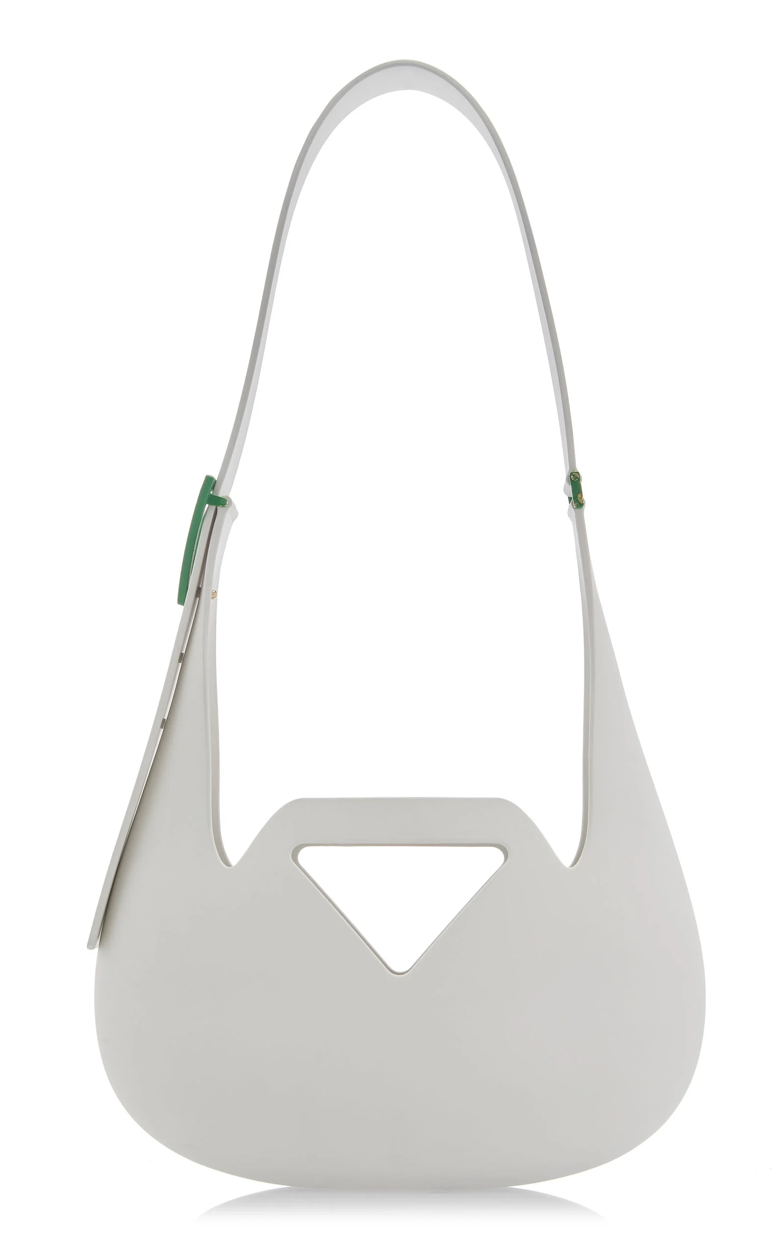 More than just the show's location, Detroit permeated Bottega Veneta's latest runway. With glossy updates on the label's ever popular handbags and industrial accents throughout, Spring '22 took full inspiration from the motor city's remarkable golden age. Crafted in Italy, this small shoulder bag has a versatile hobo silhouette with a v-shaped cutout. Keep your essentials organized with the interior pouch. PRODUCT DETAILS - Open top - Composition: matte rubber - Made in Italy SIZE & FIT - This item measures approximately 6.7 x 10.6 x 3"