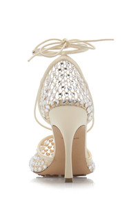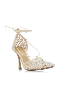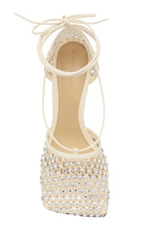 From knitted suiting sets to a colorful update on cult hit accessories, Bottega Veneta's newest collection puts a high fashion lens on everyday luxury — one that's ready for a new reality. These 'Stretch' sandals have a sleek square-toe silhouette made from netted mesh encrusted with sparkling crystals. Casual, yet elegant, they work for a myriad of occasions. PRODUCT DETAILS - Heel measures approximately 90mm / 3.5" - Self-tie fastening at ankle - Composition: mesh, leather - Made in Italy