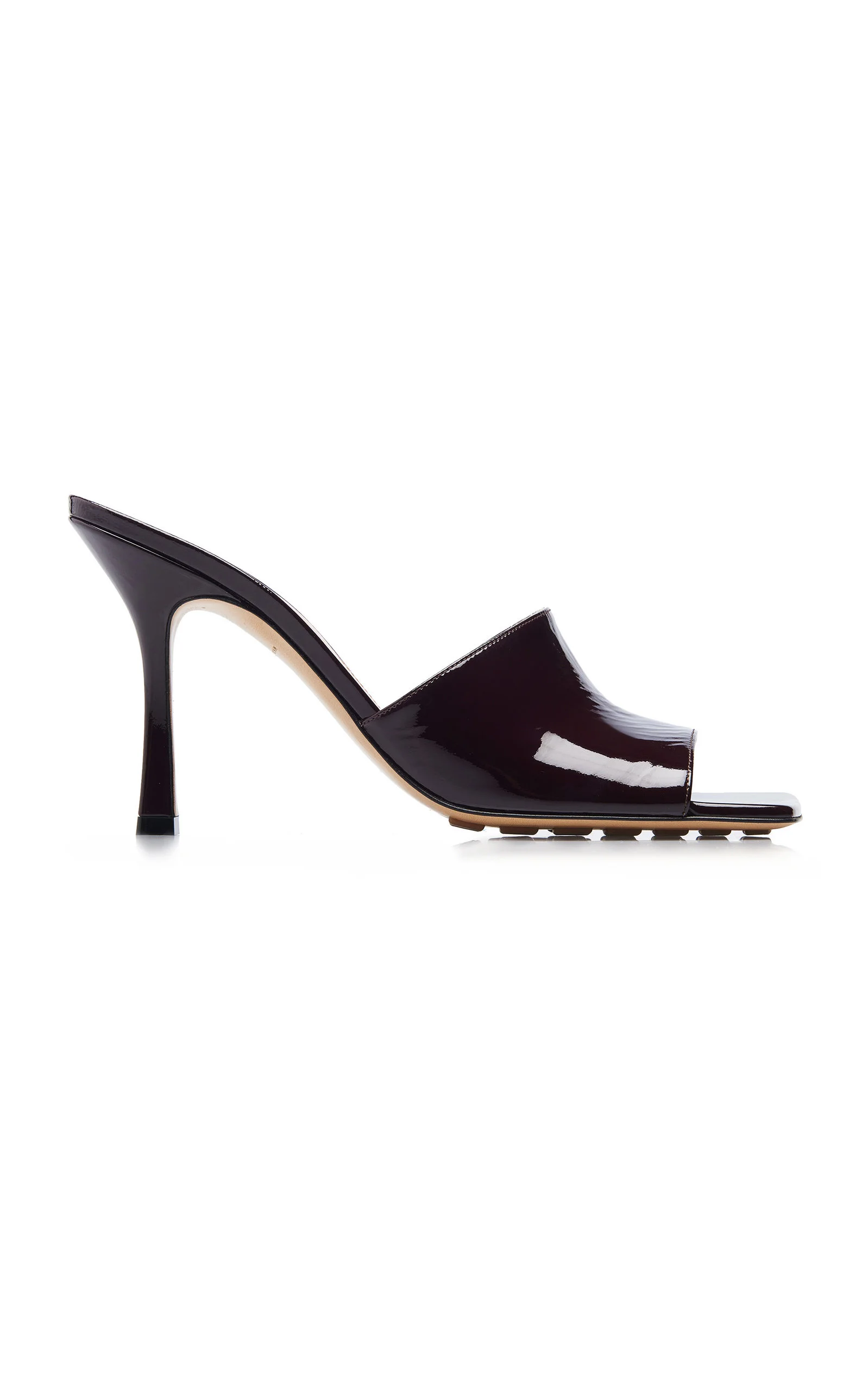 If you're a style enthusiast like us, then you've undoubtedly seen the 'Stretch Sandals' on your favorite streetstyle stars and editors. This slide iteration features the signature square-toe silhouette crafted from glossy patent leather. The cushioned soles add extra comfort and support. PRODUCT DETAILS - Heel measures approximately 90mm/ 3.5 inches - Slip on - Composition: calfskin leather - Designer color: Oxide - Made in Italy