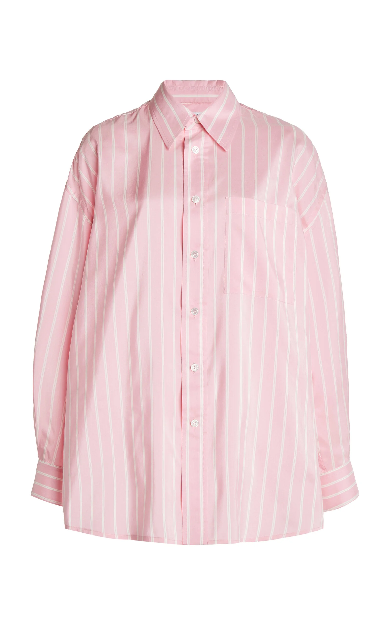 Designer Matthieu Blazy has leaned into Bottega Veneta's foundations, delivering new iterations of house signatures. Crafted of printed silk, this boyfriend shirt features an oversized design and printed stripes. As featured in the Pre-Fall 2023 lookbook, style with classic intrecciato leather accessories like an iconic woven pouch handbag for daily wear. PRODUCT DETAILS - Button fastening - Composition: 100% Silk - Dry clean - Made in Italy