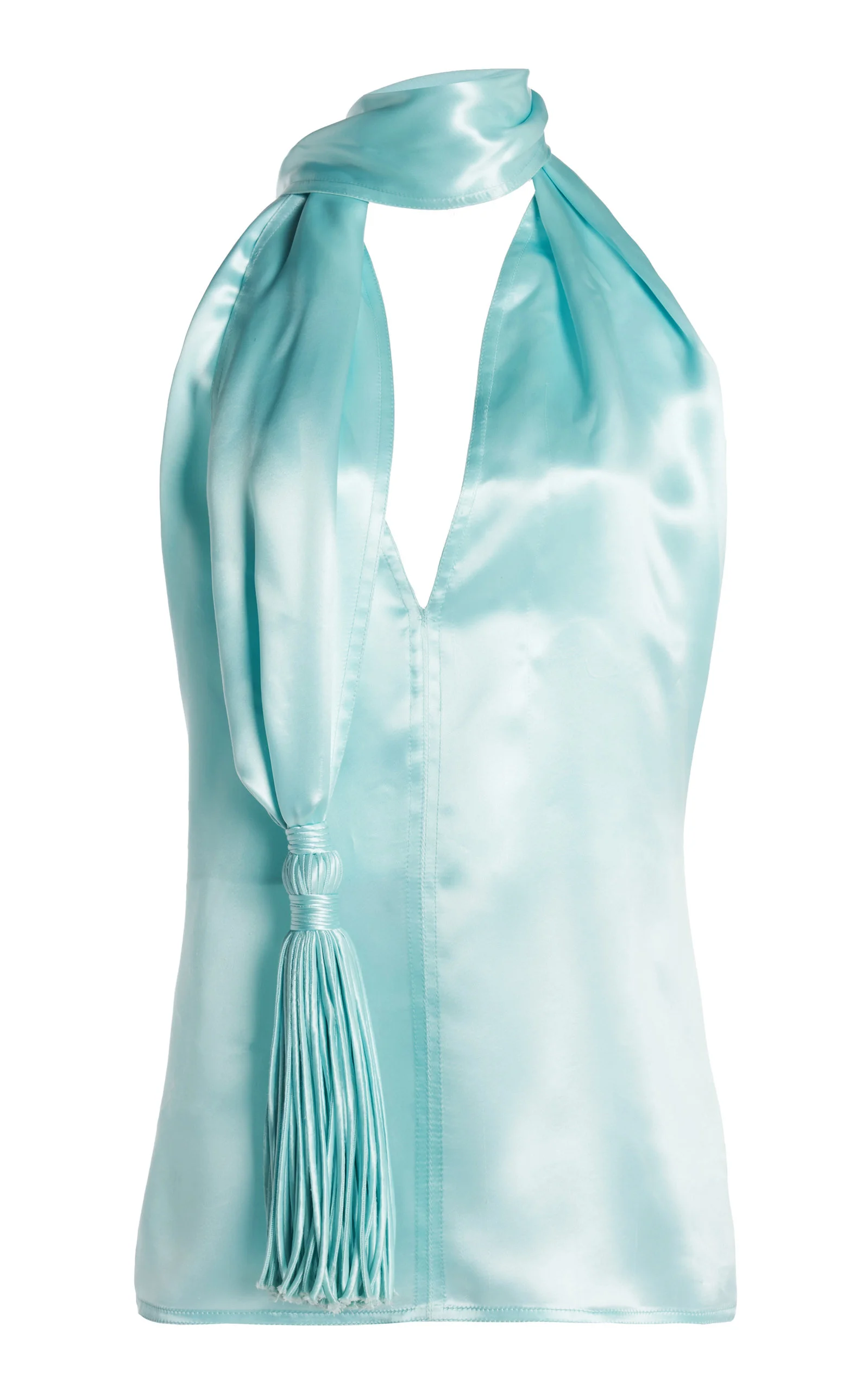 From glossy separates to sequin party pieces, as well as updates on their cult hit accessories, Bottega Veneta's latest serves as a reminder of the pleasures to be found in dressing up again. Made of fluid chintzed cupro fabric, this halter top features a tasseled strap that wraps around the neck. Wear with pleated pants and flats for a chic cocktail look inspired by the brand. PRODUCT DETAILS - Zip fastening along back - Composition: fluid chintzed cupro - Dry clean - Imported SIZE & FIT - Our model is 180cm/ 5'11" and wearing a size Small - This item fits true to size - We suggest taking your normal size