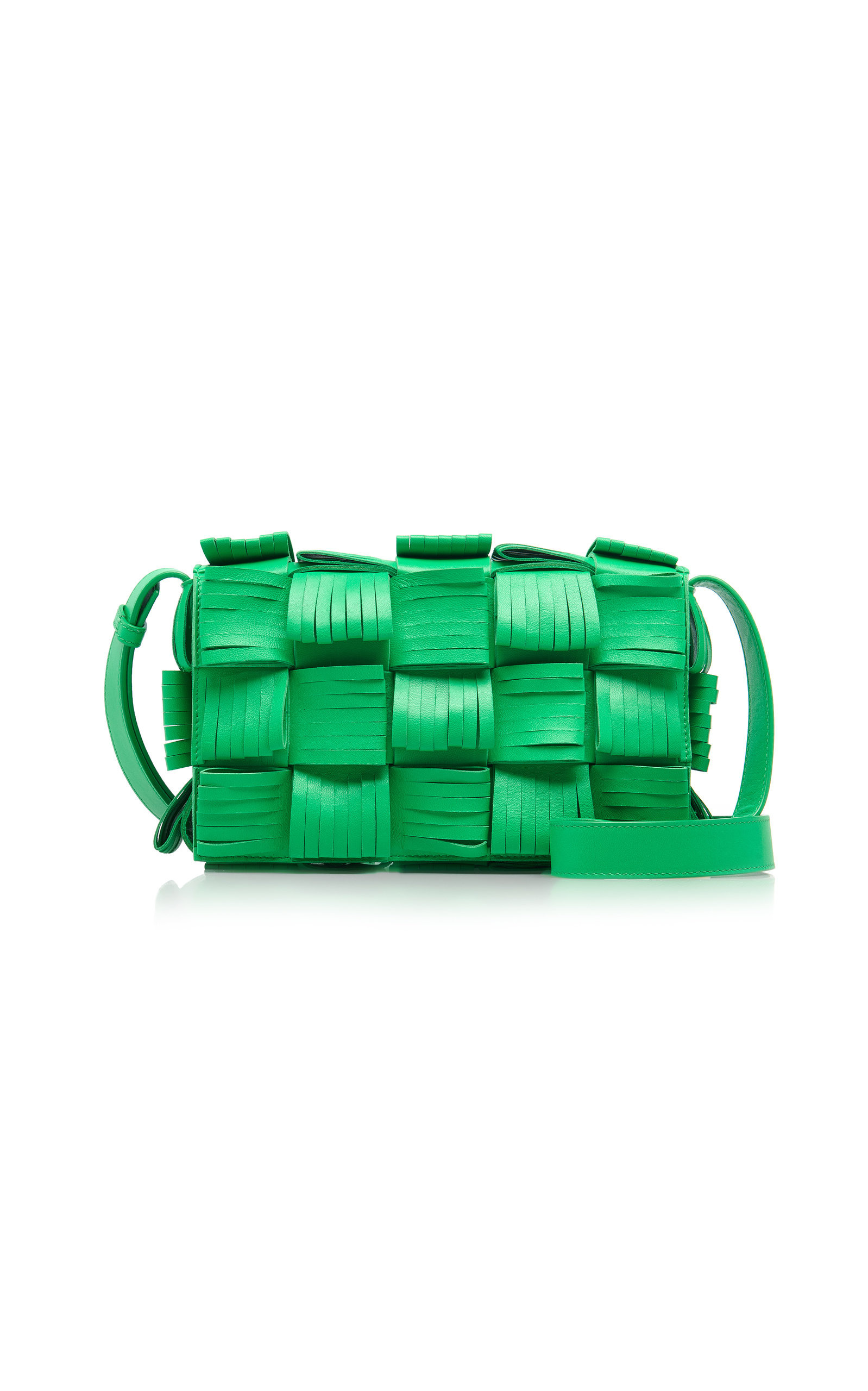 Bottega Veneta increases the proportions of its iconic intrecciato weave for the 'Cassette' bag. This iteration features the house's iconic intrecciato weave embellished with fringed strips of nappa leather. It has a mid-sized silhouette with a slim profile spacious enough to carry everything from your wallet and keys to makeup. PRODUCT DETAILS - Tuck in the adjustable shoulder strap to carry in-hand - Magnetic fastening at front flap - Composition: nappa lambskin leather - Made in Italy SIZE & FIT - This item measures approximately 10 x 2.5 x 7"