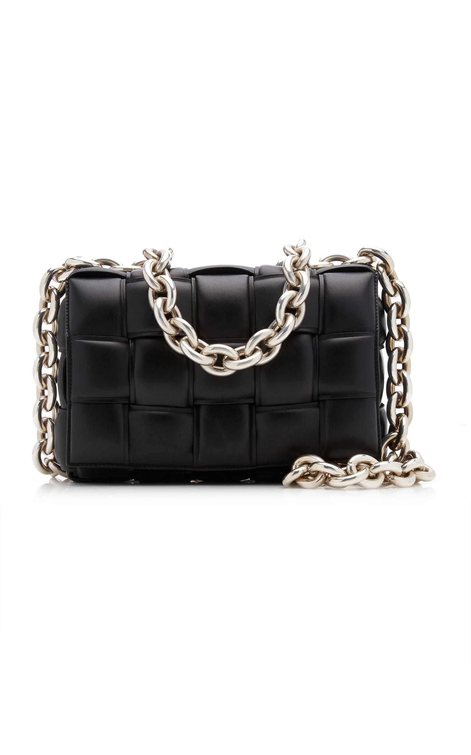 Woven using Bottega Veneta's distinguished intrecciato technique, this minimal crossbody bag is constructed from wide strips of shiny Nappa leather and embellished with a chunky chain strap. Its slim profile is still spacious enough to carry everything from your wallet and keys to makeup. PRODUCT DETAILS - Snap-fastening front flap - Composition: Nappa Woven Leather - Made in Italy SIZE & FIT - This item measures approximately 10 x 3 x 7"