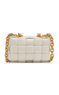 Bottega Veneta increases the proportions of its iconic intrecciato weave for its 'Cassette' bag. It's made with padded double-face nappa strips in an orthogonal weave pattern that opens to a mid-sized interior and zip pocket. This iteration is distinguished by its chunky gold-tone chain, which can be worn crossbody or doubled-up at the shoulder. PRODUCT DETAILS - Snap fastening at front flap - Composition: leather - Made in Italy SIZE & FIT - This item measures approximately 10 x 3 x 7"