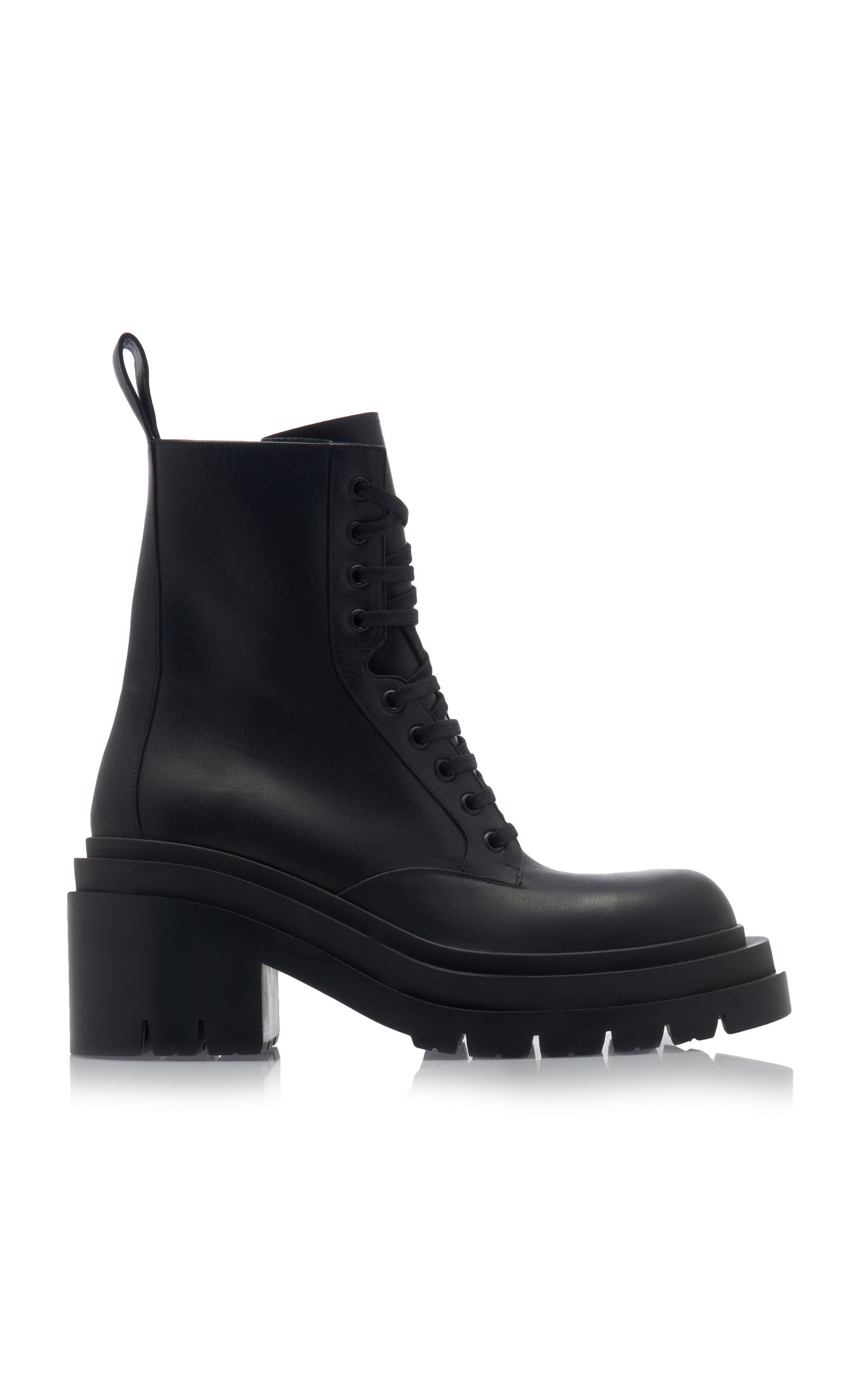 From knitted suiting sets to a colorful update on cult hit accessories, Bottega Veneta's newest collection puts a high fashion lens on everyday luxury — one that's ready for a new reality. Building on the now-signature stompy boot, this military-inspired lace-up pair is made from smooth calfskin leather set atop on-trend chunky heeled rubber lug soles. Pair with the 'Pouch' bag in a matching shade. PRODUCT DETAILS - Heel height measures approximately 2.8 inches - Lace-up fastening - Composition: calfskin leather - Made in Italy