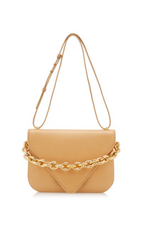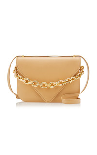 Bottega Veneta updates its signature 'Mount' bag in a new design that defines seasons and trends. Made from smooth calfskin leather, it has a gusseted silhouette with an envelope flap front that nods to house codes. The large shape will house all your daily essentials. PRODUCT DETAILS - Carry in-hand by the chain or attach the adjustable sliding strap to style a number of ways - Magnetic fastening at front flap - Designer color: Almond - Composition: calfskin leather - Made in Italy SIZE & FIT - This item measures approximately 8 x 10.7 x 2.75"