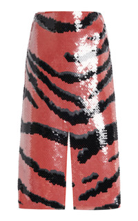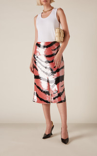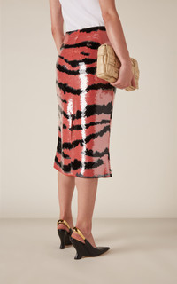 Since his debut last year, designer Matthieu Blazy has leaned into Bottega Veneta's foundations, delivering new iterations of house signatures. Sequined throughout in a fun tiger print, this slim midi skirt features a center slit. Wear yours with a tank top and leather pumps. PRODUCT DETAILS - Zip fastening - Composition: 100% viscose - Made in Italy SIZE & FIT - Our model is 180cm/ 5'11" and wearing a size Small - Fits true to size, our fit specialist recommends taking your normal size