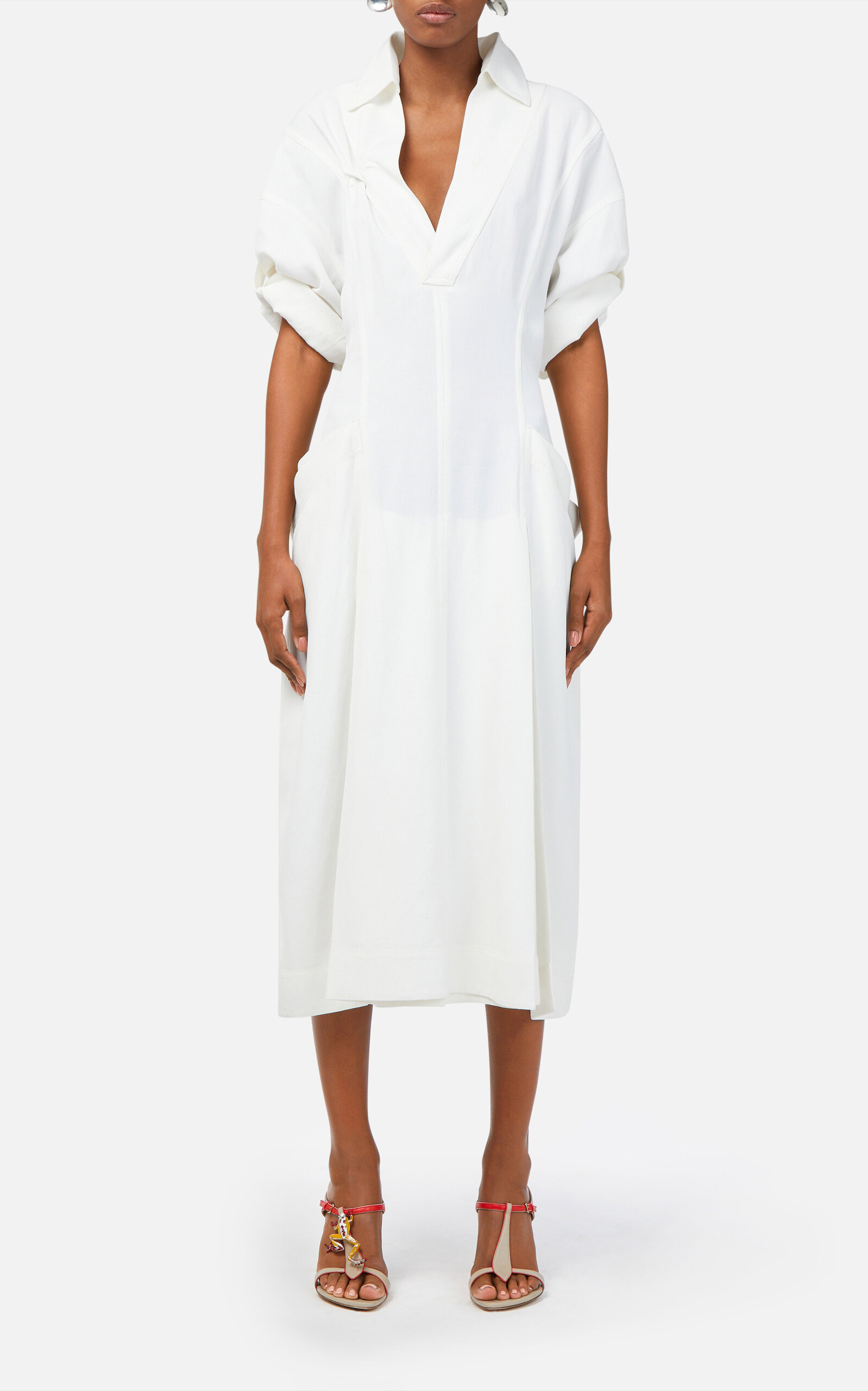 Raise A Bit Of Cm From Neck; The Silver D-Ring Belt Will Be Added; Frog Brooch Will Be Gold And Fixed On Sleeve; Giving Half Size To Hips, Raising Armhole By 6 Cm, Raising Neckline By 9 Cm PRODUCT DETAILS - Short cuffed sleeve, open collared neck, paneled design, side pockets, midi hem - Concealed zip fastening along side - Partially lined - Composition: Viscose linen - Color: Chalk - Dry clean only - Spring/Summer '25