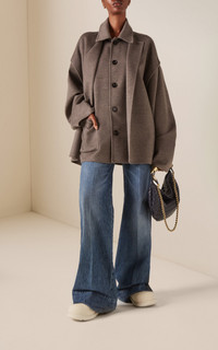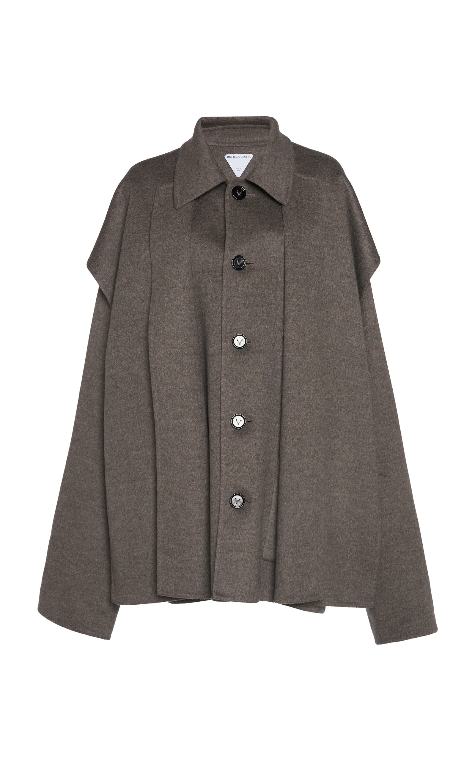 Designer Matthieu Blazy has leaned into Bottega Veneta's foundations, delivering wearable iterations of house signatures. Tailored from double-faced wool-cashmere, this button-front coat has an oversized silhouette with a layered effect thanks to the placket and dropped shoulders. PRODUCT DETAILS - Resort '24 - Button fastenings through front - Composition: 80% wool, 20% cashmere - Designer color: Peppercorn - Dry clean - Made in Italy SIZE & FIT - Our model is 181cm/ 5'11" and wearing a size IT 38 - Fits true to size, our fit specialist recommends taking your normal size - Designed for an oversized fit