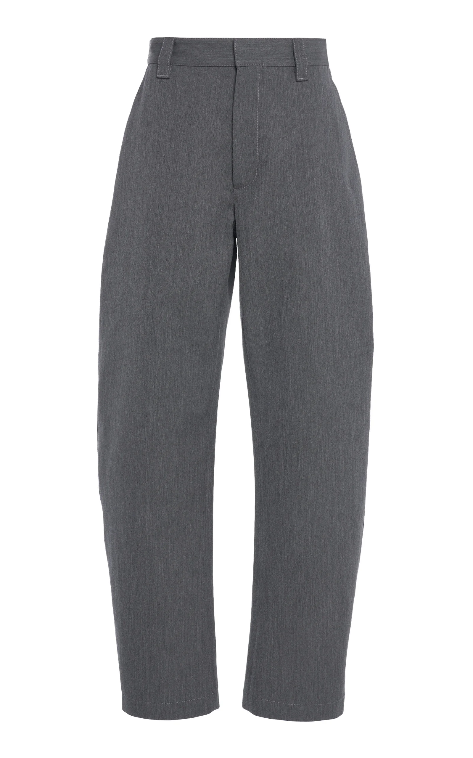 For Bottega Veneta's Fall '23 show, Matthieu Blazy delivered with a collection that ups the fashion ante while simultaneously delivering real-life wearability. Tailored in Italy from double-faced bonded wool-cotton, these trousers have a high rise and wide legs that taper towards the cuff. Emphasize the silhouette with sky-high pumps. PRODUCT DETAILS - Concealed hook and zip fastening along front - Composition: 54% wool, 46% cotton - Designer color: Charcoal - Dry clean - Made in Italy SIZE & FIT - Model is wearing a size IT 38 - Designed for a relaxed fit