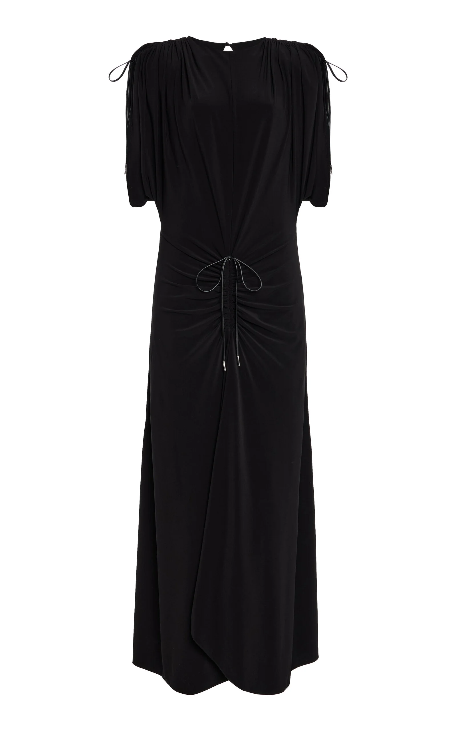 PRODUCT DETAILS - Slim fit, half sleeves, plunging V-neck drawcord detail, gathering - Slips on - Composition: Jersey-95% Polyester, 5% Elastane - Color: Black - Dry clean - Made In: United States of America - Resort '26