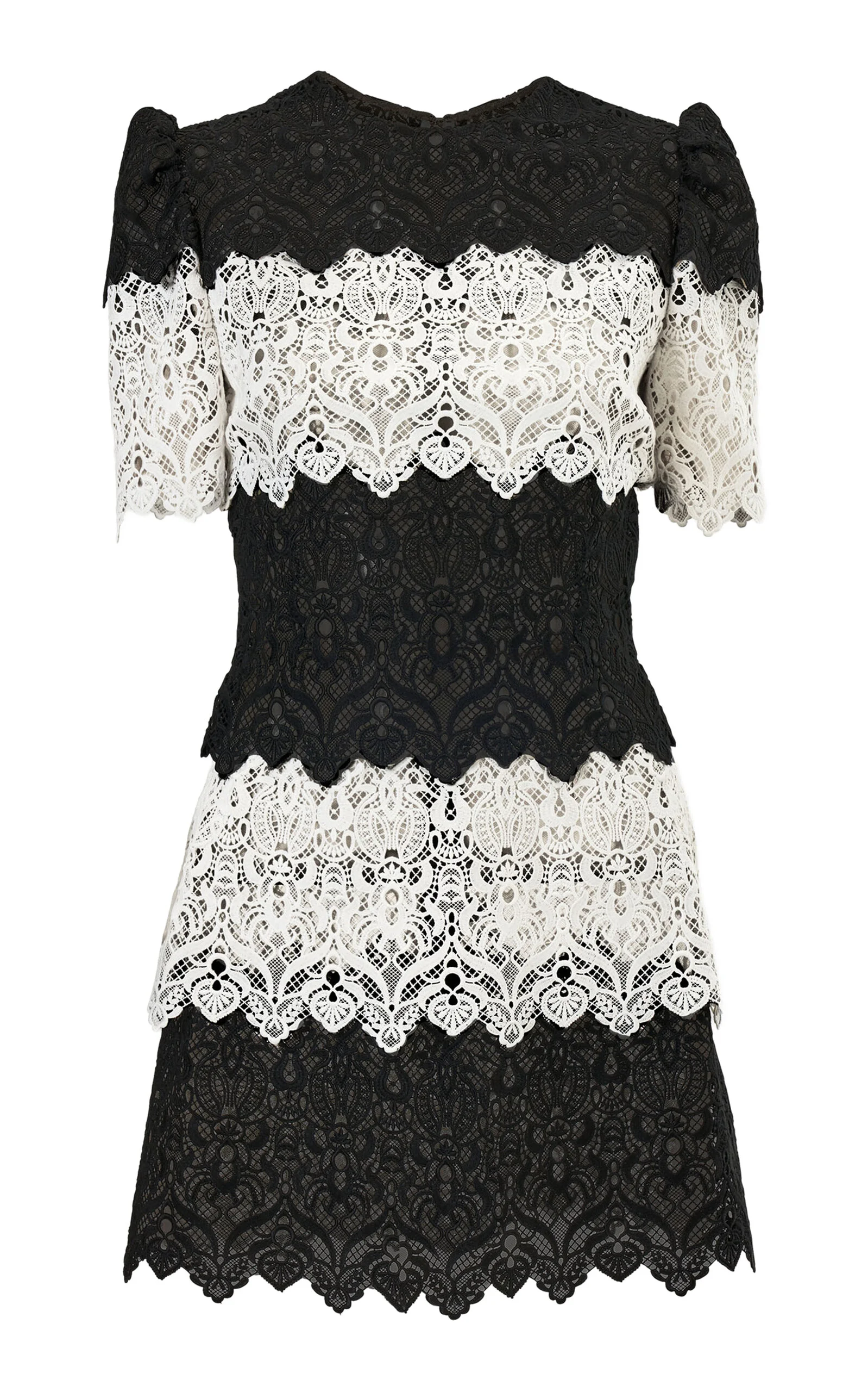 Crew Neck Floral Scroll Lace Trim Mini Dress black/white