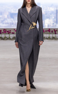 Complete the look with the tulip brooch from the runway. PRODUCT DETAILS - Fall '25 - Does not ship with brooch - Regular fit, longline silhouette, padded shoulders, peak lapels, contoured waist, vented back hem - Button fastening - Lined - Composition: 46% recycled wool, 36% sustainable viscose, 17% recycled polyamide, 1% elastane - Color: Charcoal Grey Multi - Dry clean - Made in the USA